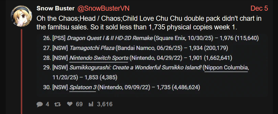 >>556632921Nah, he's right. We've known how shit new Inti games chart for a while now, so there was no chance or reason to expect for a re-release to sell well. Majogami not charting, on the other hand, is legitimately catastrophic and makes me question how much longer they can realistically survive.
