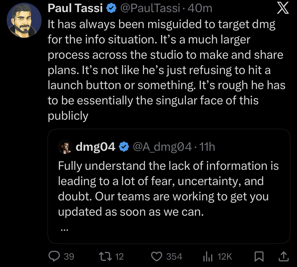 >>556726826>>556727293all CMs, GMs, devs and journalists are friends with each other or have a connection in some wayPaul is most likely on a behalf of dmg or someone else creating an image of dmg as a victim, so that community stops asking. Thats how they control narrative, reddit it self is full of shills doing exact same. The other day they desperately tried to make paint lawsuit settlement as victory for bungie, literally citing bungie lawyers and pretending it was judge words