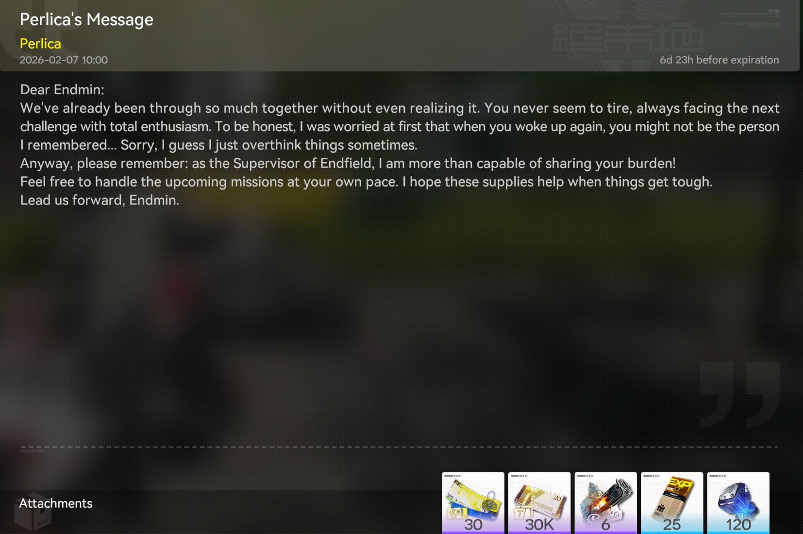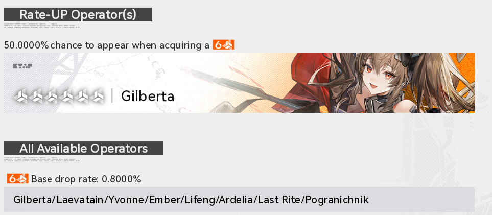 ITS TIME!!!Previous thread: >>556599842>Gilberta Official Media (Current banner)https://www.youtube.com/watch?v=8hZVxeiSmQ4 - EP trailerhttps://www.youtube.com/watch?v=BQom1V9TdbM - Story trailerhttps://www.youtube.com/watch?v=h70w5ZmXLkE - Combat Demo>News / Dev CommsFebruary 4th - (Optimizations, balancing, and free standard 6* selector)https://endfield.gryphline.com/en-us/news/3846>Official Websitehttps://endfield.gryphline.com/en-us>Official EN X (NEWS HERE)https://x.com/AKEndfield>Chartered Headhunting ScheduleJanuary 21st to February 7th --- "Scars of the Forge", (Laevatain)February 7th to February 24th --- "The Floaty Messenger", (Gilberta)February 24th to March 13th --- "Hues of Passion", (Yvonne)>Reward CodesENDFIELDGIFTENDFIELD4PC>Twitch Dropshttps://endfield.gryphline.com/special/third-party-binding?channel=twitch>Voyage to the Stars (Ongoing until March 4th)https://endfield.gryphline.com/activity/voyage-to-the-stars/en-us/>Special Launch Streamhttps://www.youtube.com/watch?v=dz2g_D52NR0 >Official Release Trailerhttps://www.youtube.com/watch?v=oJ00ggFb8A0 >Official Release PV'shttps://www.youtube.com/watch?v=5Xm45NwWOlo https://www.youtube.com/watch?v=UPpeeft1-8o https://www.youtube.com/watch?v=tN80M6IEMo0 >Wikishttps://wiki.skport.com/endfield (Official)https://perlica.moehttps://warfarin.wiki/enhttps://endfield.wiki.gg/>Blueprint Guideshttps://talospioneers.com/en>Stickershttps://drive.google.com/drive/folders/13KH3L6QPIKkVH7pBddv4uxwmwJsnOtklhttps://drive.google.com/drive/folders/1OuVtjv1k-9c3M6n7d4PX3CGG5bkwH04ahttps://drive.google.com/drive/folders/1AStB8bzFk3lSwMwczWPkFYCBrZe0vHOghttps://drive.google.com/drive/folders/1yS0lqUhxf8tBRtpDFfCU1y16IS2sSeF7>Fr/end/sSubmit your info, /end/min:https://forms.gle/Fo7BhZMKaKqiWyL19View other /end/mins:https://docs.google.com/spreadsheets/d/1YtxiDss0hgEQhLlZgpfzyGrJrzUcqDzOS9T6IH-BiVc/edit?usp=sharing