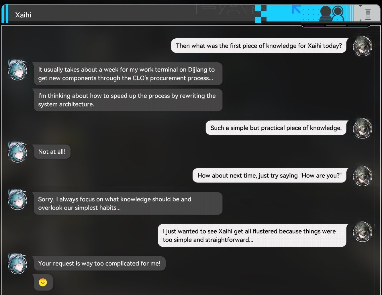 >>556625806I don't deny that it's real and urgent, but it doesn't really feel that way because of how quickly we're pushed without a lot of connective story to reinforce it. I felt kind of blindsided by the Monitoring Center bit, which is how I expected things to go or at least feel for more of the arc. It's probably less about the actual events of the narrative story and more about the setting of the city itself. The story just feels so at odds with the actual gamespace and what we're doing.Hard to describe, but I wish we'd had some more meat on the bone for the stakes of the characters and city. Another arc between our arrival from Jingyu Valley and our solution of "just use the AIC", where we get to experience more of the regular schmucks in the city needing help from either us or their protectors.