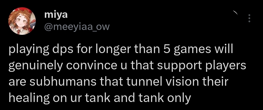 >queue up for a game >nobody wants to play support >3 duelists and 2 tanks >the last player has yet to pick their role>mere seconds go by but they feel like years>they pick jeff that’s how i knew we were gonna lose that match