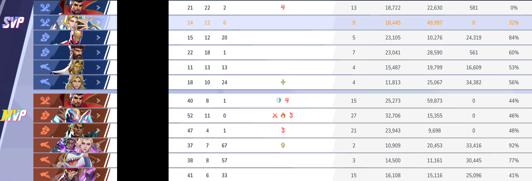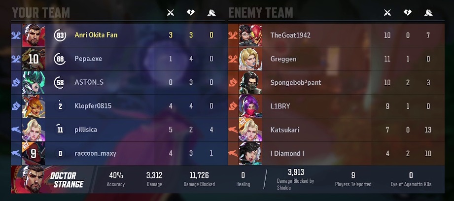 >>556621673yeah, that's part of it.many of them being 275 now means a lot of her combo breakpoints don't work nearly as consistently now and she can't secure the kill before they get healed.the buffs to their defensive combative ability also contribute to it, like invis getting damage buffs and her self shield, gambit being able to 1v1 most of the roster in general, luna having a faster snowball, and so on.buffs to existing characters and the addition of certain new characters outside of the support role has also made it more difficult for her. bucky's grounding punch makes approaching him in close quarters far more dangerous and he's far better at peeling, angela and rogue are mobile tanks that are good at marking dps on off angles in general (basically just hulk if he was actually good), thing's grounding aoe being way bigger and lasting way longer, daredevil simply existing and having permanent wallhacks shuts down a lot of flanking options in general as well.all of these aren't problems specific to her, but moreso just universal flanking problems in general that has made the playstyle far less effective. the name of the game at the moment is basically to just play poke or hard dive, which psy is still decent at doing and i think she only needs a small buff or two. characters like magik and bp are straight dogshit at the moment though