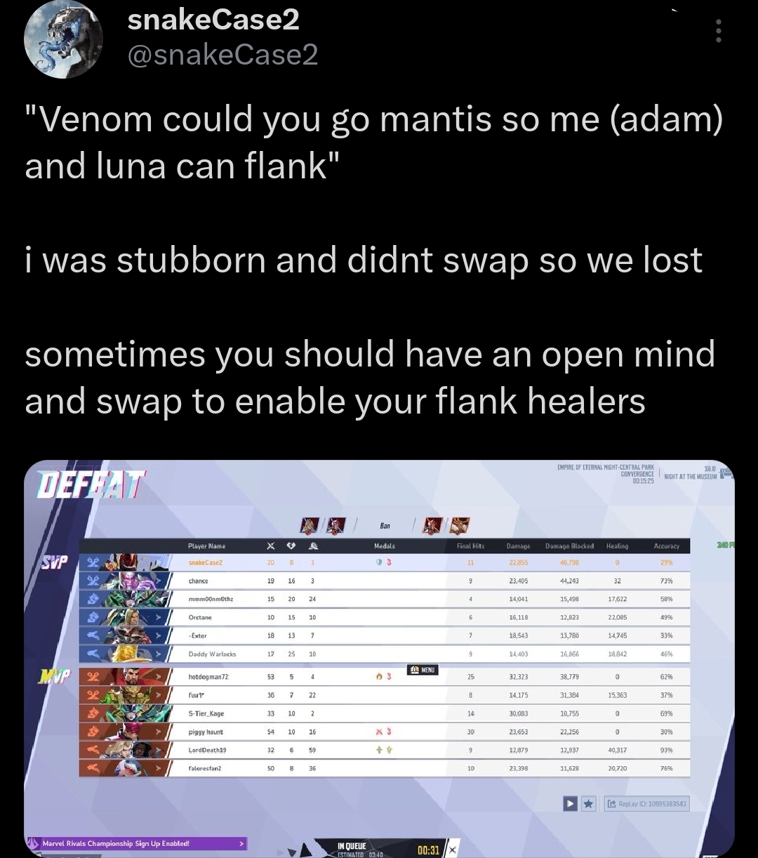 >Universally Nerf damage by 30%>Universally Nerf healing by 40%>Double the charge needed for every ult (besides Adam Warlock)There, I saved the game. You're welcome.