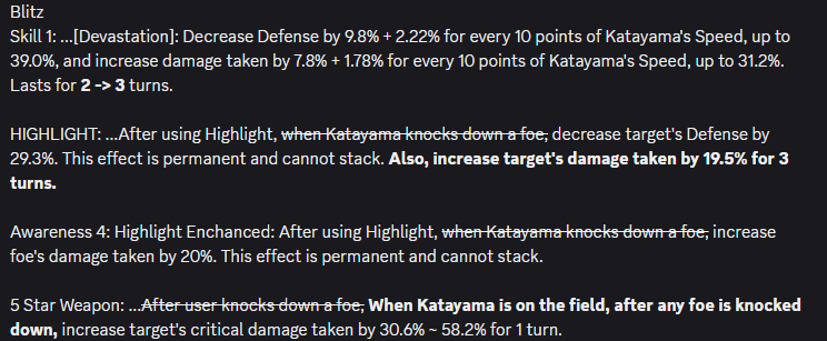 >AoE bosses have a base Down value of 5, making Skill 2 unable to guarantee Down before A1. Single-target bosses have even higher Down values, lowering her effectiveness further. >Although she has multiple self-buffs (passives/skills), enemies stand up at the end of their turn, removing the debuffs—making it difficult for her to benefit from them. >Her 4 weapon activates when enemies are Downed, but without A1 the efficiency drops sharply—making the 3 weapon a reasonable alternative.She sounds absolutely terrible.She'll need some very serious buffs to be usable.That sucks, I can't believe they flopped the Katayama unit this fucking hard.