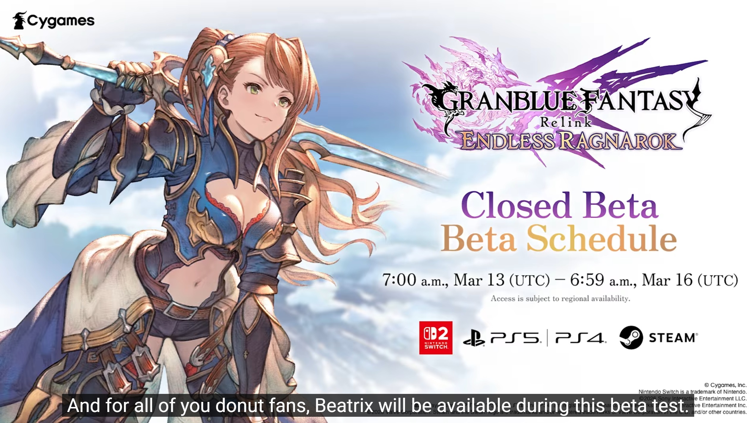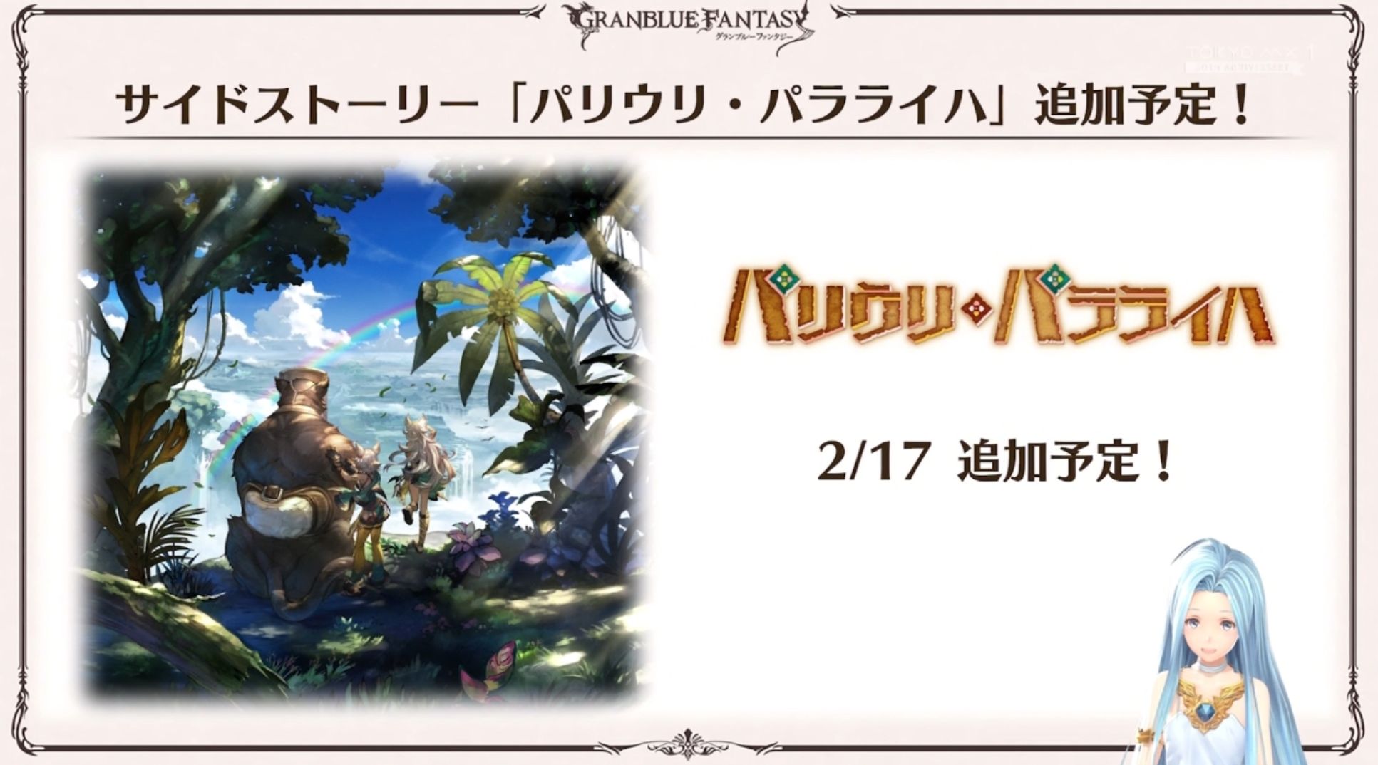>January Schedule01/28 - 02/06 - Monscian Act II>February Schedule02/06 - 02/13 - Records of the Ten (Uno/Quatre)02/13 - 02/19 - Freedom's Dirge (Rerun)02/13 - 02/28 - Valentine Messages02/14 - 02/28 - Alchemist Event02/19 - 02/26 - Dread Barrage (Wind Adv.)>Future Schedule04/06 - 04/13 - Unite & Fight (Water Adv.)>Granblue Relink: Endless Ragnarok - 7/9Closed Beta>https://relink-ragnarok.granbluefantasy.com/en/cbt/Latest Info>https://youtu.be/9tnOYh_jIZ0 [Open]Maggie/Bea/Eustace/Gallanza playable>How to StartGo to https://game.granbluefantasy.jp in any Chromium-based browser>READ THE FAQ before posting - It will answer most of your questions if you're new or learninghttps://gbf.wiki/FAQ>Helpful links - These links contain useful information like important guides and other stuffGranblue Fantasy Toolbox - https://mizagbf.github.io/GBF Advanced Search - https://gbfas.ioGBF Grid and Teambuilding - https://gbfguide.comMain Story Recap - https://calico.nekoweb.org/gbf/story/Wiki Advanced Grids - https://gbf.wiki/Advanced_Grids/gbfg/ Mega Pastebin - https://pastebin.com/xHkyQTy8/gbfg/ Crew Directory - https://rentry.org/gbfgcrewsPrevious >>556439014