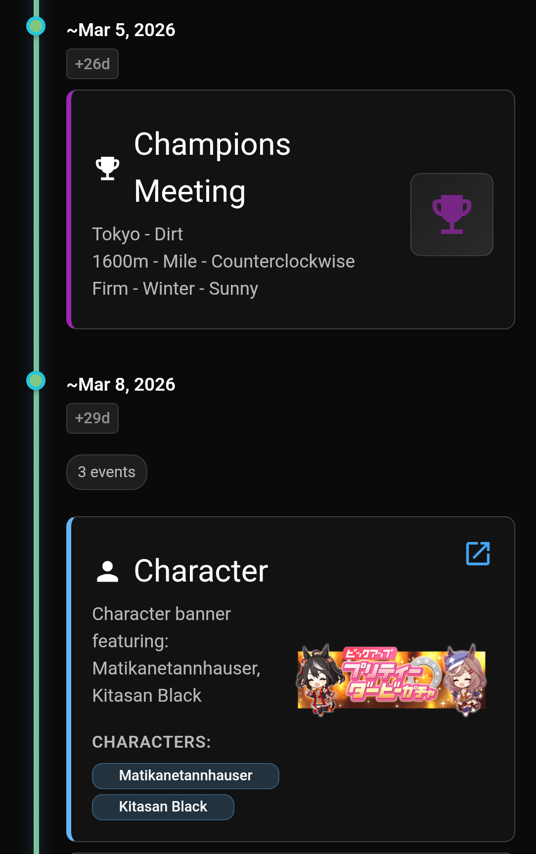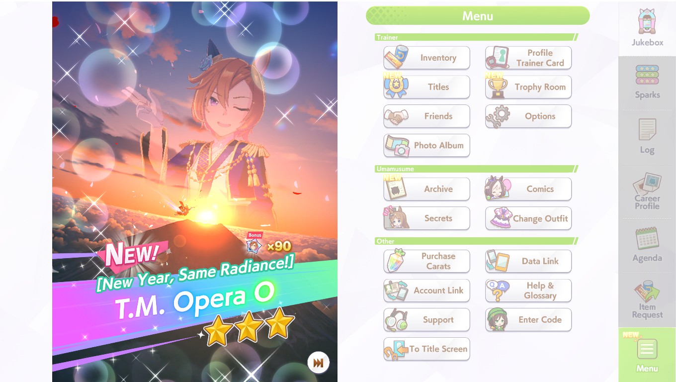 Previous: >>556631627>Global Game NewsLink your account to Cygames iDCurrent Scenario: Aoharu Hai aka "Unity Cup"Current Rate Up Trainee: New Year's Scout (3*), New Year T.M. Opera O (3*), New Year Haru Urara (3*)Current Rate Up Support Cards: New Year's Scout (SSR), SSR Sasami Anshinzawa (Pal), SSR Admire Vega (Power), SSR Matikanefukukitaru (Speed), SR Tamamo Cross (Guts)Current CM: Capricorn Cup - Chukyo Turf 1200mMain Story Chapter 5 is out01/27 - New Beginnings Part 101/29 - NY Opera & Haru 3*+Fuku SSR+Ayabe SSR02/05 - 02/12 Racing CarnivalMid February - Capricorn Cup - Chukyo Turf 1200mhttps://umamusume.com/news/100040/https://pages.snep.pw/uma/anni-skill-changes/>JP Game NewsCurrent Rate Up: Valentine Taiki Shuttle (3*), Valentine Sounds of Earth (3*), SSR Matikanefukukitaru, SSR Neo UniverseNew Scenario "Yukoma Hot Spring" releasedTimeline: https://uma.moe/timelineCygames Webstore: https://webstore.cygames.com/en/umamusume_en/>Thread Clubshttps://rentry.co/umaglobalclublistYou must be E3 (20k points) to join a circle. Apply with /uma/ or /vg/ in your profile or post ID in the thread.>All Guides & Resourceshttps://rentry.org/uma26Game databasehttps://gametora.com/umamusume (Click the gear to switch between JP / global server info)A basic guide for newfagshttps://rentry.org/umaglobalFind networks if your region is blocked from the game or clienthttps://www.umavpn.top/93Seiyuu & Concertshttps://rentry.org/umstUma Texthttps://umareader.idsmile.xyz/