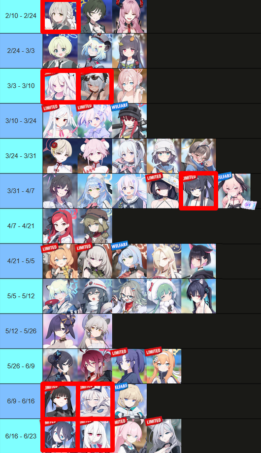 Previous Thread: >>556631809>Guides, Resources and useful links:https://rentry.org/bagguides>/bag/Circles/Clubs/Friends:https://rentry.org/holdingthebag>4koma, Manga, Side Content, PVs & Shortshttps://rentry.org/bacontent>>(JP) – JST>Banners:>2/5 After Maint – 2/12 10:59IchikaKasumiSakurakoEimi (Swimsuit)>News:Patch notes: https://bluearchive.jp/news/newsJump/624>Events:Steel Continent Assault: Malkuth Battle – 1/29 After Maint – 2/12 10:595th Anniversary Login Bonus – 1/20 After Maint – 2/12 10:59>Content:Limit Break Assault: Chokmah (Field w/Special Armor) – 1/21 11:00 – 2/12 3:593x Commission/Lesson – 2/5 4:00 – 2/12 3:592x Account EXP – 2/7 4:00 – 2/9 3:59>>(GLOBAL) – UTC>Banners:>1/27 After Maint – 2/10 1:59Misaki (Swimsuit)Saori (Swimsuit – Limited)Hiyori (Swimsuit – Limited)Neru (Bunny – Limited)Karin (Bunny – Limited)Akane (Bunny)>News:Patch notes: https://forum.nexon.com/bluearchive-en/board_view?thread=3355429>Events:Sheside outside – 1/27 After Maint – 2/10 1:59The Arius District's Emergency Class Mission – 2/3 2:00 – 3/10 1:59My Office: https://bluearchive.nexon.com/user/myoffice>Content:Grand Assault: Chesed (Field – Torment w/Elastic Armor) – 2/3 2:00 – 2/9 18:59Limit Break Assault: Chokmah (Field – w/Special Armor) – 1/14 2:00 – 2/9 18:592x Commissions/Hard – 2/2 19:00 – 2/9 18:592x Bounty/Scrimmage – 2/9 19:00 – 2/16 18:592x Account EXP – 2/13 19:00 – 2/15 18:592x Normal – 2/16 19:00 – 2/23 18:592x Account EXP – 2/20 19:00 – 2/22 18:59