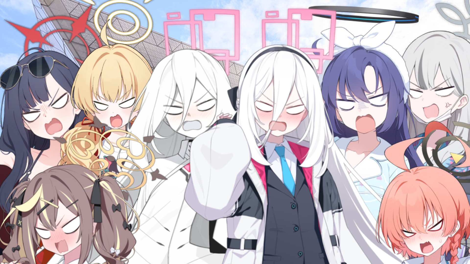 >Li, Beatrice, Nozomi, Pi, Sersie, SapphireThere is a lot of characters in the waiting room/