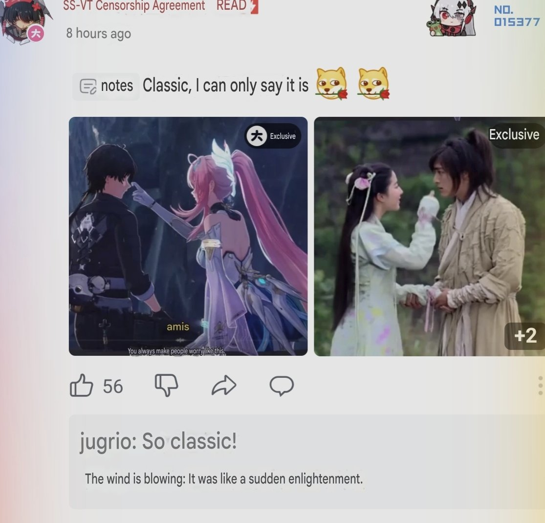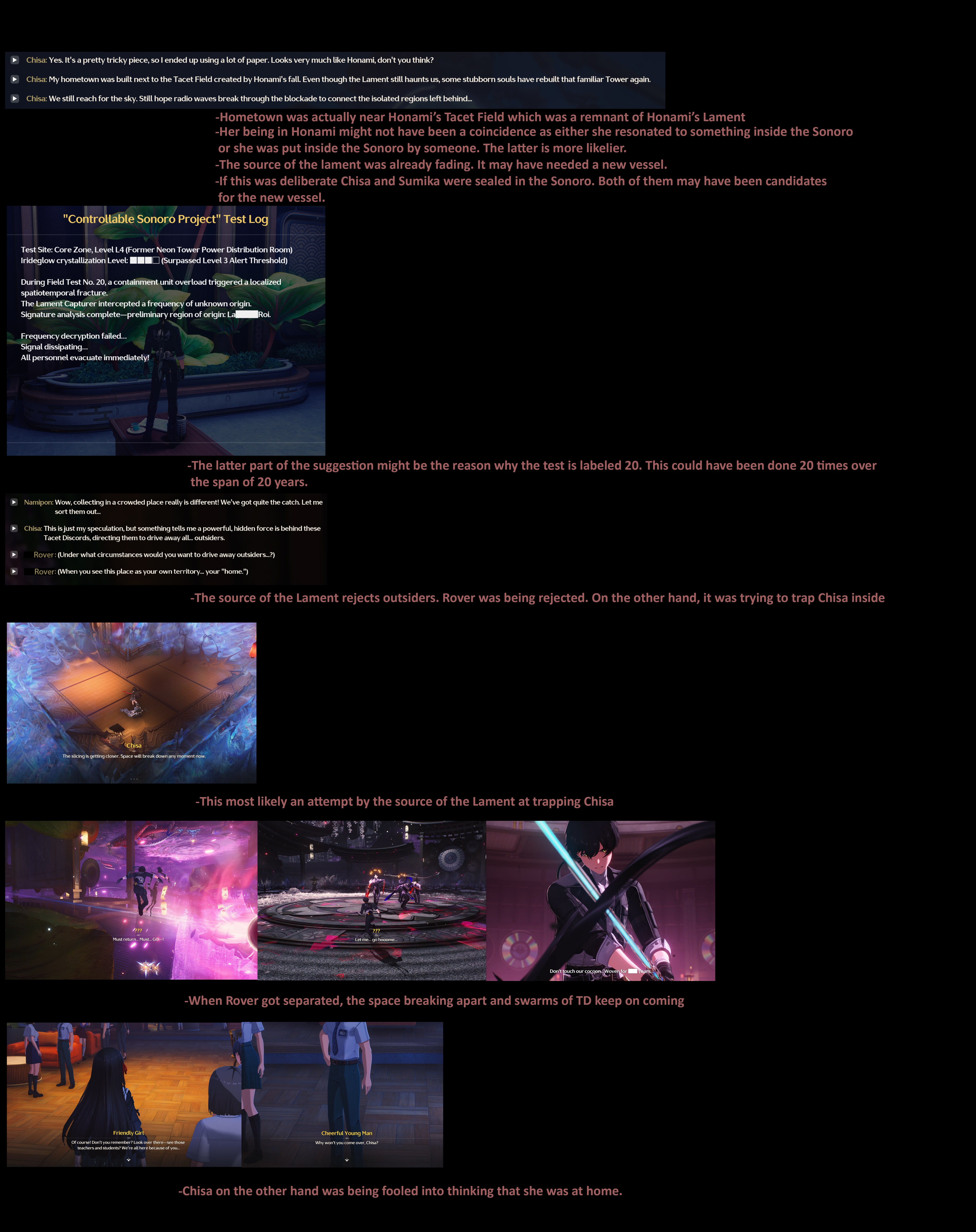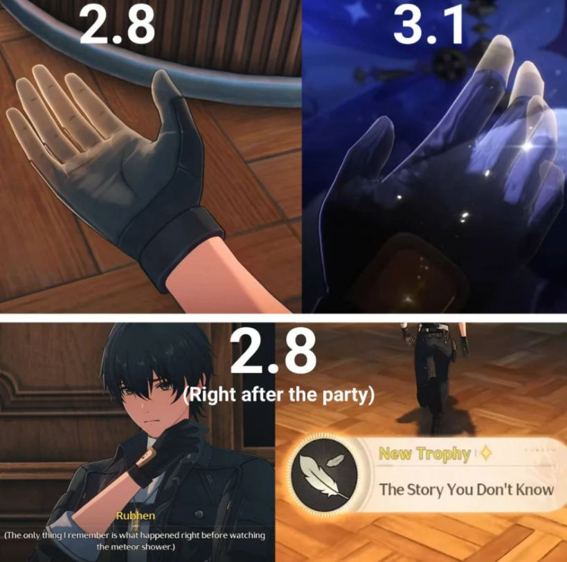 >>556728851>how exactly did both rover exist at the same time, was it because rover (present) jumped into voidspace which let him to physically transport to different timeline?Exactly. Rover (Present) was in the past and pushed Aemeath (Baby) back to where she came from for Rover (Past) to finish the rescue job.>so the scene happened at 3.0 wasnt during travel thru portal, but after rover (present) pushed ames (baby) out of the lake?Eh, those sort of happened simultaneously in the void space, I just ordered 5, 6, and 7 arbitrarily. Both Aemeath (Present) and Rover (Present) were in the past, the 3.0 booping happened to 3.0 Rover while he traveled to Lahai Roi, but it was 3.1 Aemeath who booped him before traveling all the way to Ancient Lahai Roi.