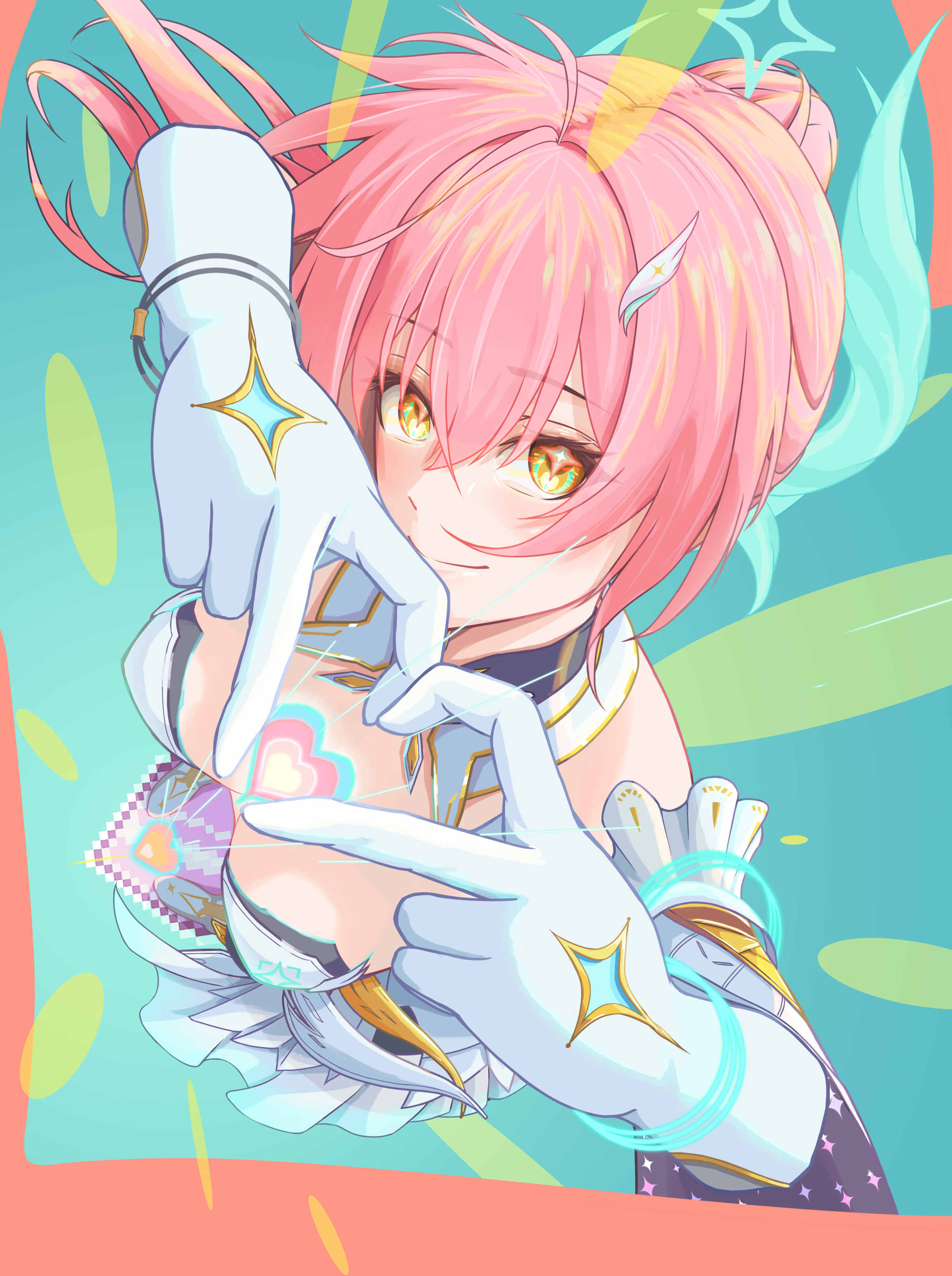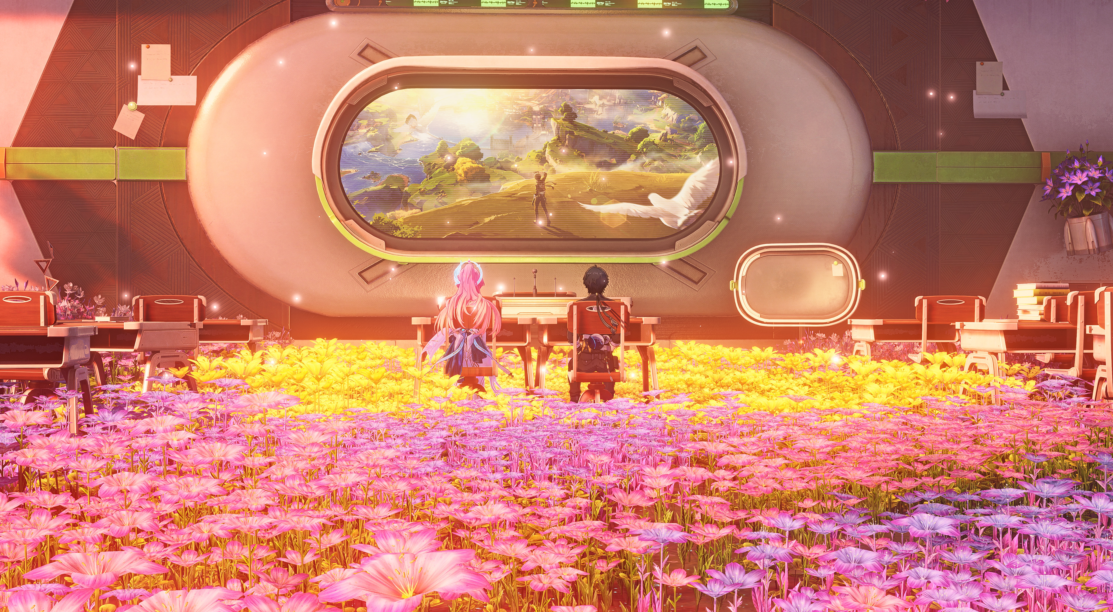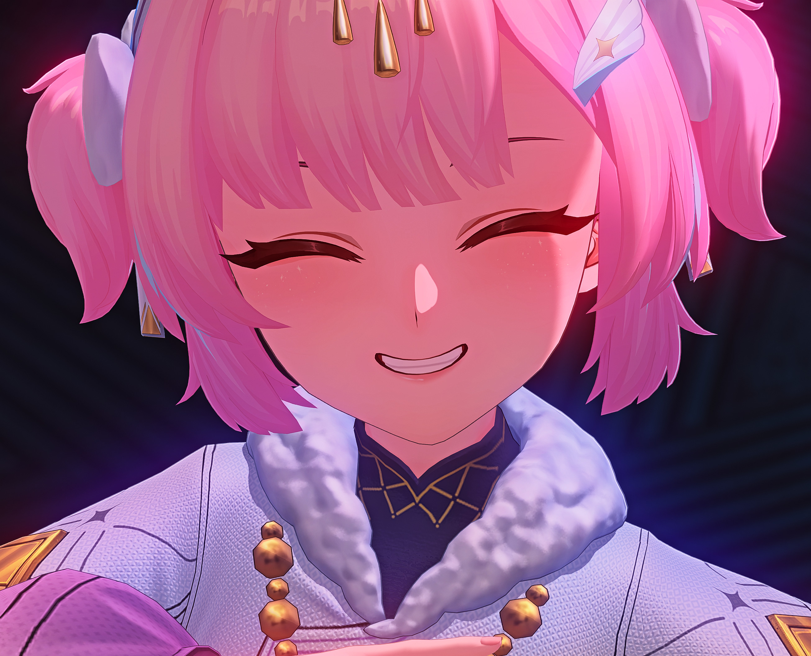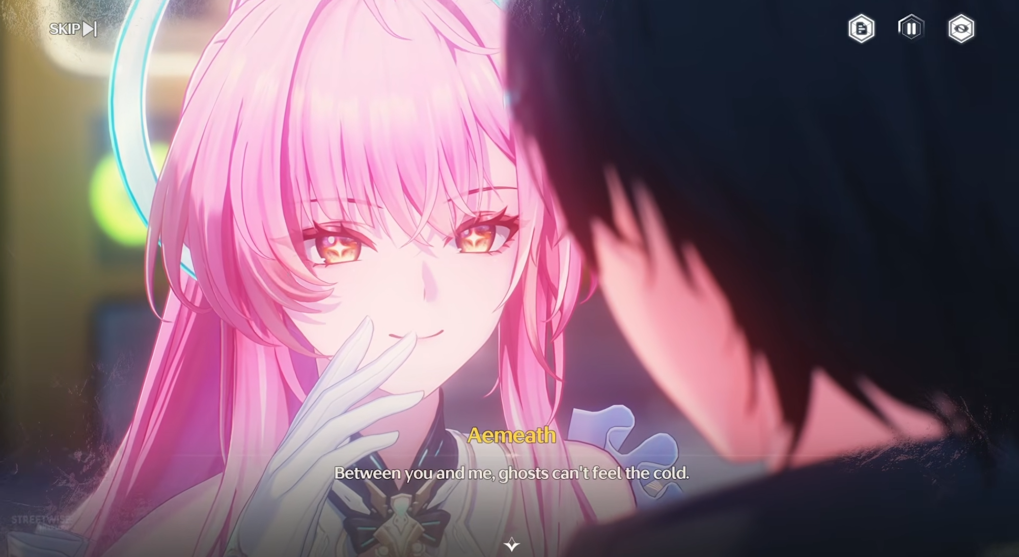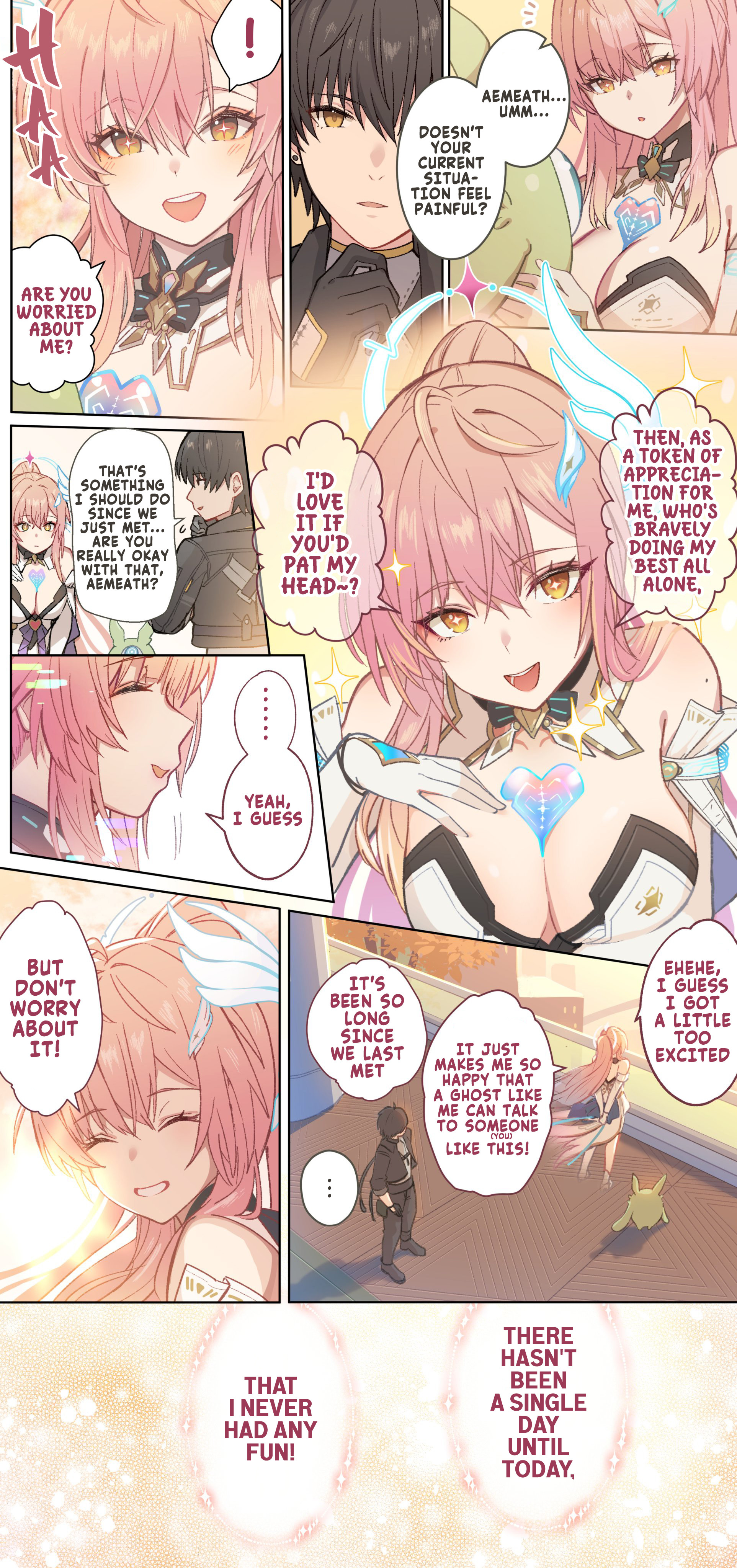 >Oh wow! You're a pink protagonist too?>Haha, cute little heart details. I love the heart on your chest!>You're also part of a time loop? What are the chances!>Really does feel like a small universe sometimes doesn't it?