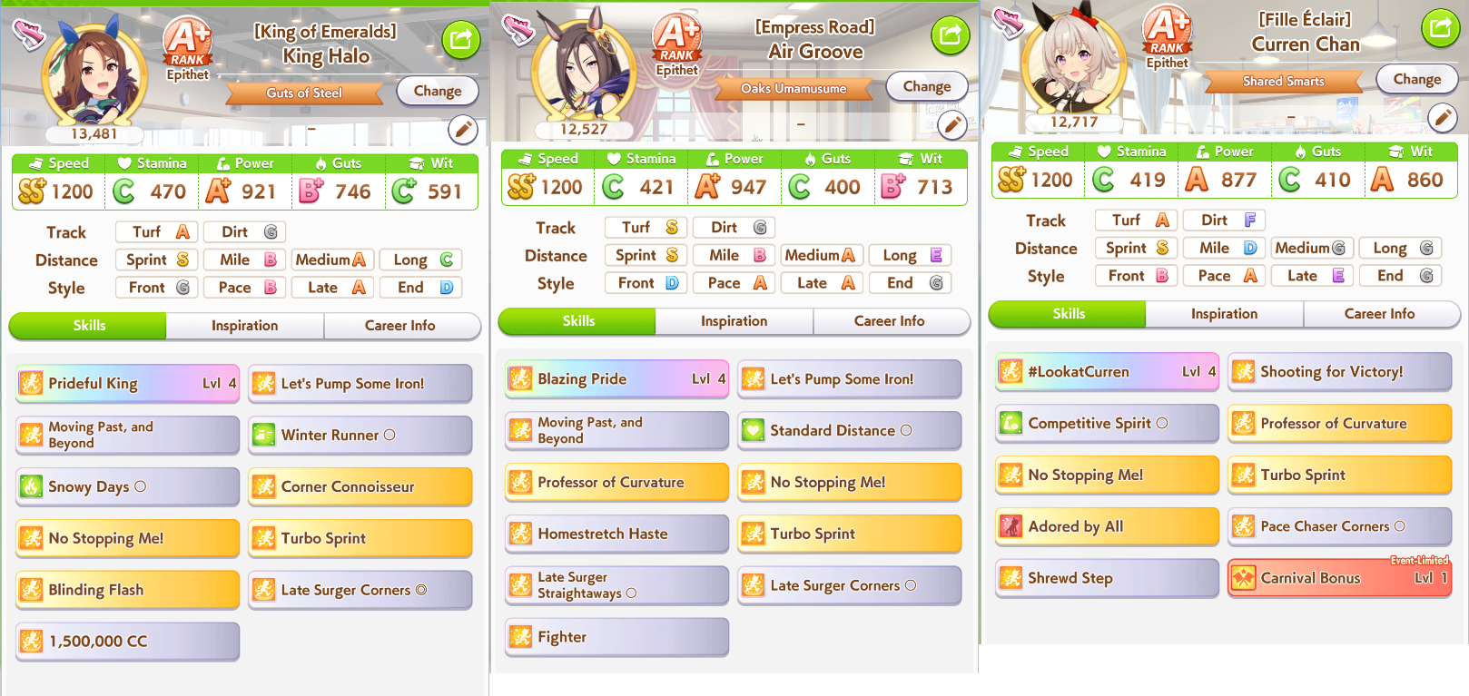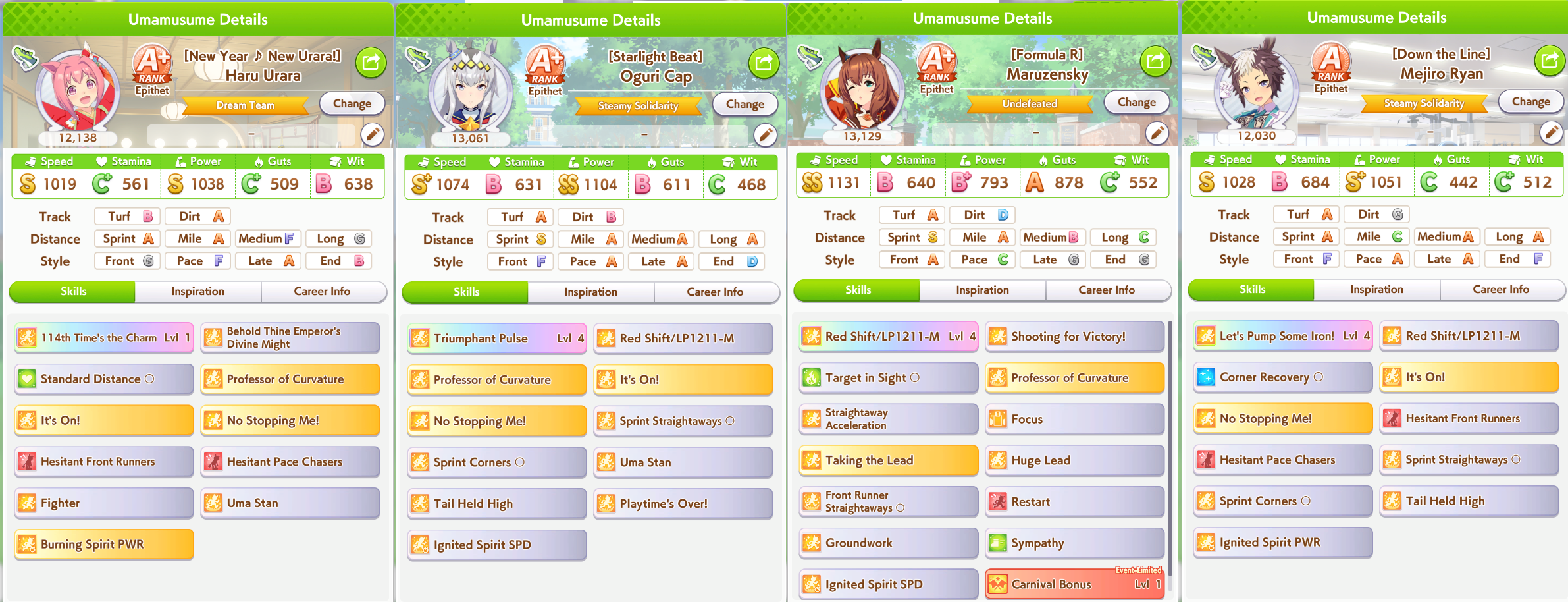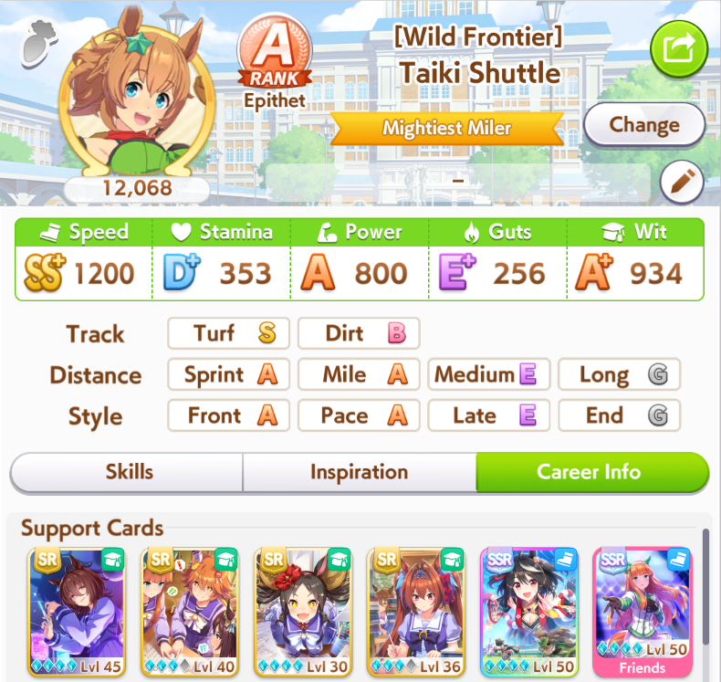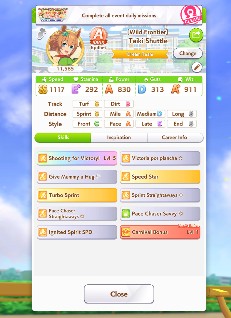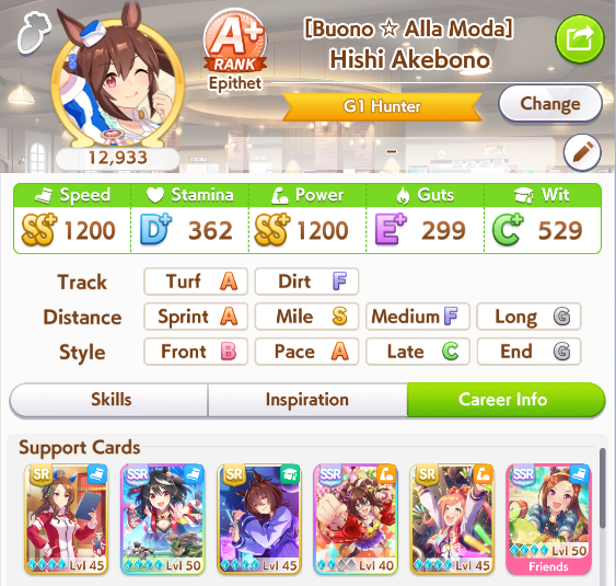 Well I forgot about the first race in Taiki's special event so I missed out on 120 free stats and 2 head-on hints but I think this might be good enough to contend in Capricorn anyway... what do you guys think?