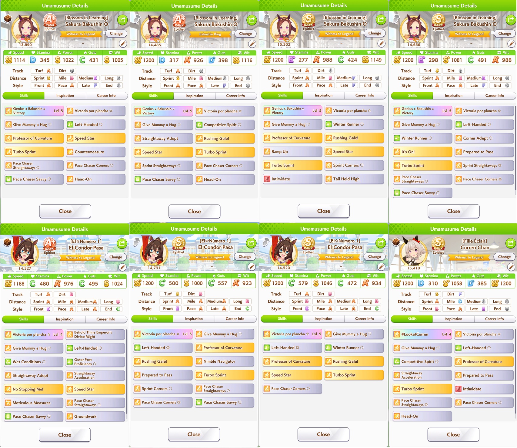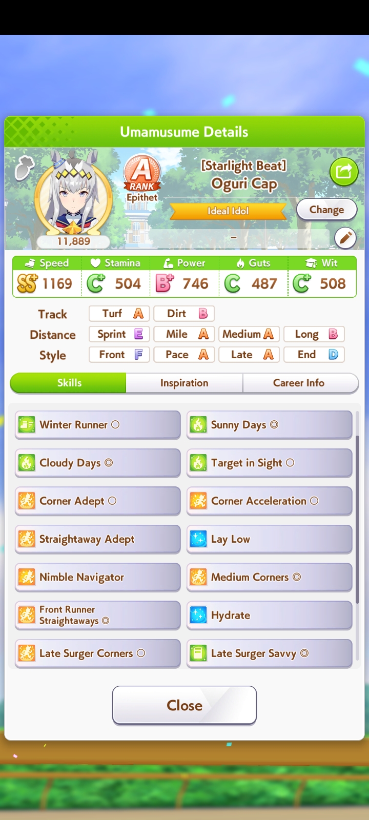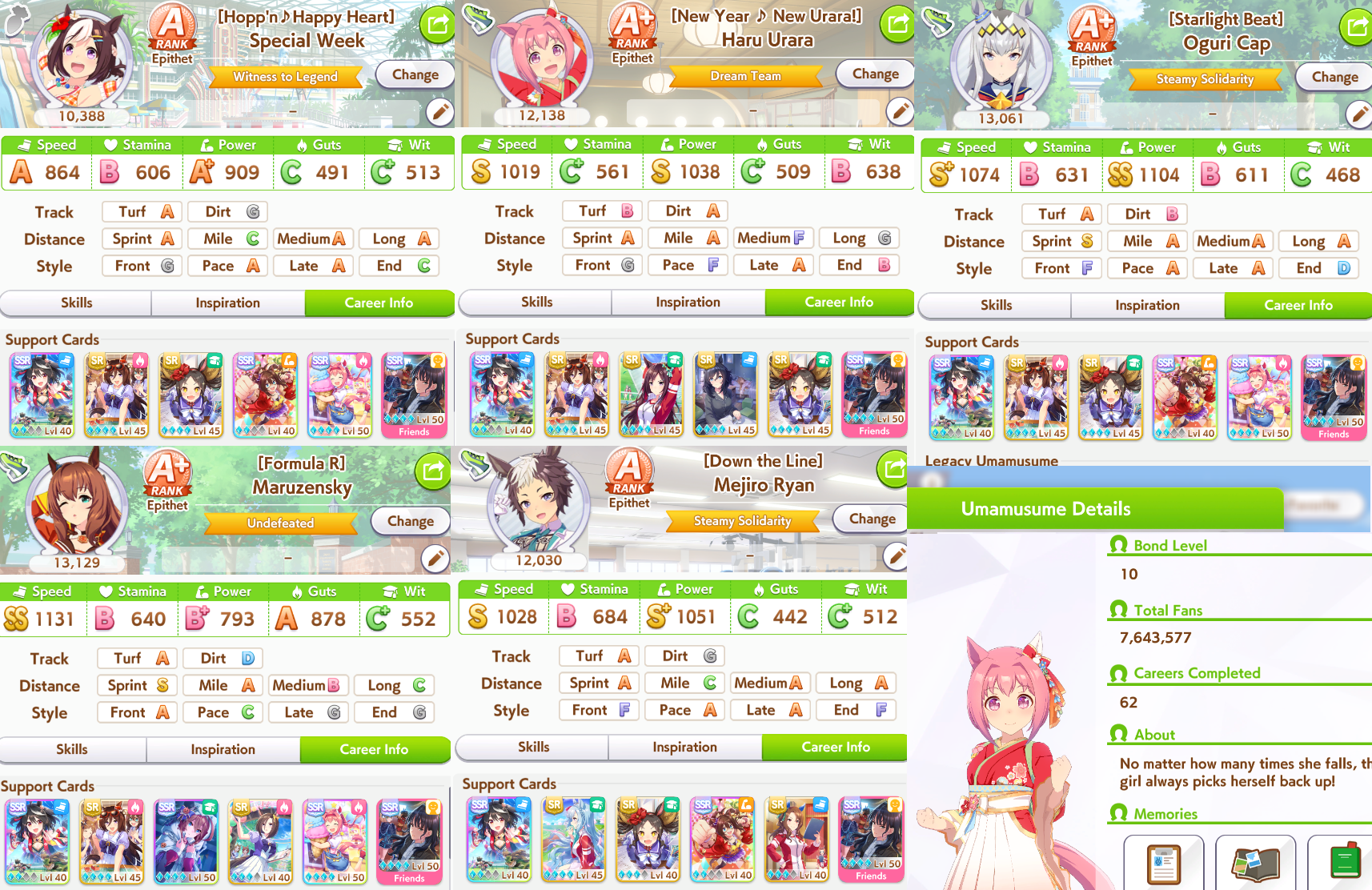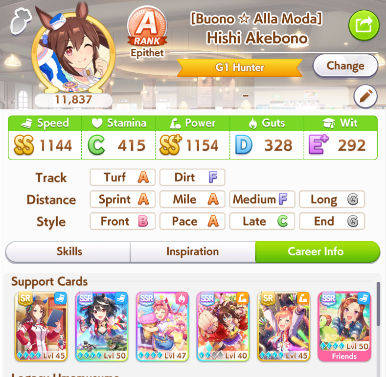 Well I forgot about the first race in Taiki's special event so I missed out on 120 free stats and 2 head-on hints but I think this might be good enough to contend in Capricorn anyway... what do you guys think?