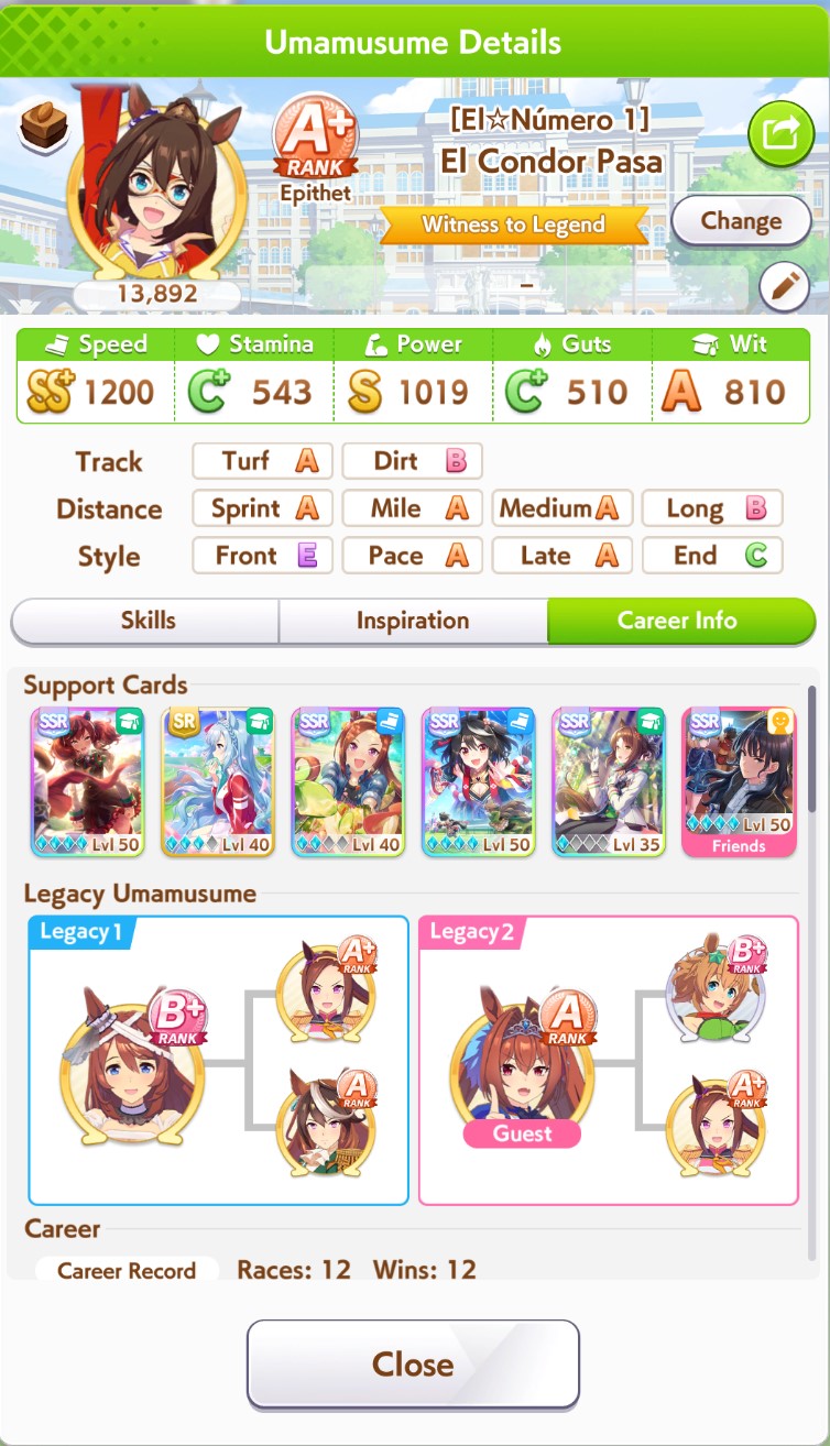 >>556737560A+ umas that can run may be possible but S is not within reach with those cards. You may be kinda fucked unless you unbrick yourself with the free pulls on the NTR banner.You are better off borrowing Kitasan and using another wit card of your own, either Fine Motion 0LB or Ikuno 3LB are your options from all these cards.You can use power inherits from parents.That should give you an uma like Pasa to max speed with good wit. If you need stamina, you are forced to borrow the Riko SSR card (MLB of course) so use the Taishin card. Try getting the Brian SSR speed card to MLB as soon as you can since you have no speed cards. It's a shame you skipped half the yeppers event and marvelous sunday event, those cards were core for F2P's on the next scenario.