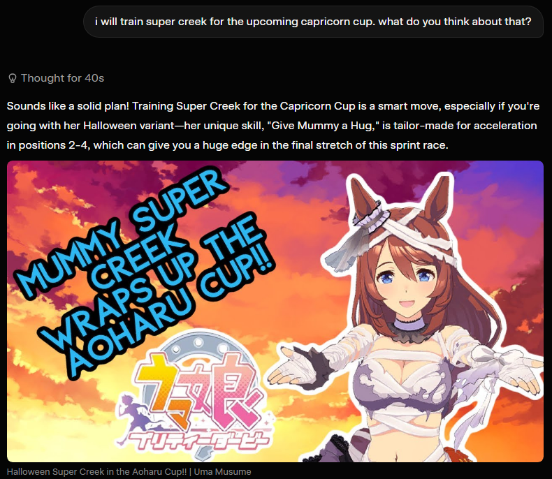 Previous: >>556702393>Global Game NewsLink your account to Cygames iDCurrent Scenario: Aoharu Hai aka "Unity Cup"Current Rate Up Trainee: New Year's Scout (3*), New Year T.M. Opera O (3*), New Year Haru Urara (3*)Current Rate Up Support Cards: New Year's Scout (SSR), SSR Sasami Anshinzawa (Pal), SSR Admire Vega (Power), SSR Matikanefukukitaru (Speed), SR Tamamo Cross (Guts)Current CM: Capricorn Cup - Chukyo Turf 1200mMain Story Chapter 5 is out01/27 - New Beginnings Part 101/29 - NY Opera & Haru 3*+Fuku SSR+Ayabe SSR02/05 - 02/12 Racing CarnivalMid February - Capricorn Cup - Chukyo Turf 1200mhttps://umamusume.com/news/100040/https://pages.snep.pw/uma/anni-skill-changes/>JP Game NewsCurrent Rate Up: Valentine Taiki Shuttle (3*), Valentine Sounds of Earth (3*), SSR Matikanefukukitaru, SSR Neo UniverseNew Scenario "Yukoma Hot Spring" releasedTimeline: https://uma.moe/timelineCygames Webstore: https://webstore.cygames.com/en/umamusume_en/>Thread Clubshttps://rentry.co/umaglobalclublistYou must be E3 (20k points) to join a circle. Apply with /uma/ or /vg/ in your profile or post ID in the thread.>All Guides & Resourceshttps://rentry.org/uma26Game databasehttps://gametora.com/umamusume (Click the gear to switch between JP / global server info)A basic guide for newfagshttps://rentry.org/umaglobalFind networks if your region is blocked from the game or clienthttps://www.umavpn.top/93Seiyuu & Concertshttps://rentry.org/umstUma Texthttps://umareader.idsmile.xyz/