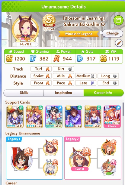 >>5567230932 speed(Kita+ 3MLB Bakushin SSR or borrow Teio) 4 Wit or 3 Wit borrow RikoI rolled a copied of Bakushin SSR and final Ardan LB on free rolls>>556723180She is the easiest one to make. Just spam spirit bomb for skills.