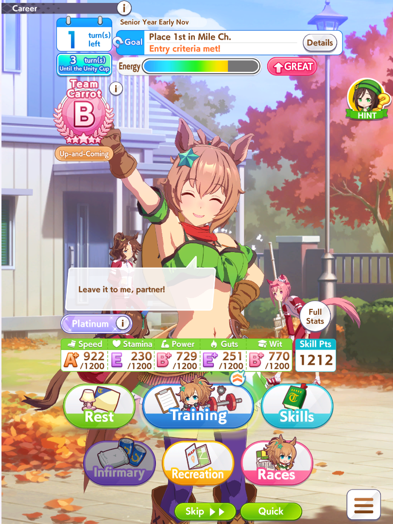 >>556736073I tried adding Power in my recent Condor run by selecting an inspirer with the Power trait. I exclusively trained Stamina during Summers to prevent any setbacks.While this is well-rounded all things considered, maximizing Speed is integral to winning races.What if I only selected Supports that focused on Training Effectiveness and Friendship, ignoring Mood and Skills?