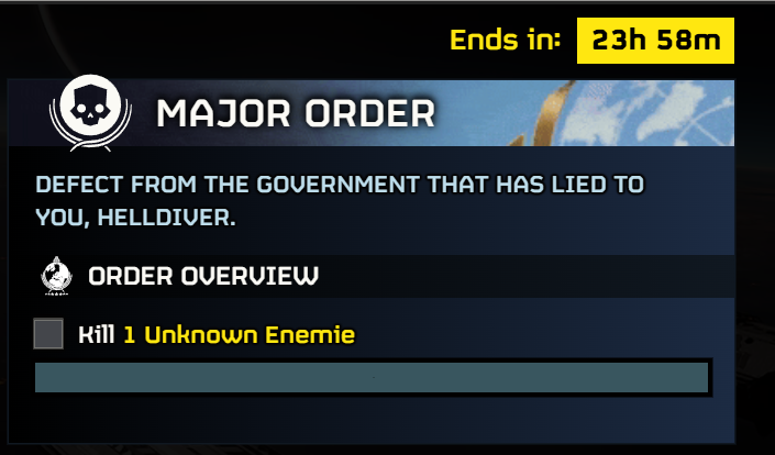 >>556767773>The Democracy Officer calls the shotsNo he doesn't lol. The final decision as to where to deploy is the Helldivers, who can choose completely ignore the major order and deploy on the other side of the galaxy if they so choose. MO's are literally just suggestions to us.
