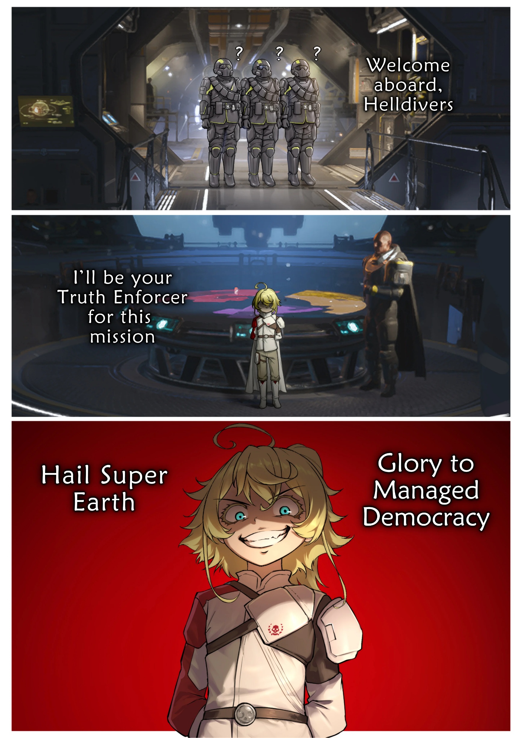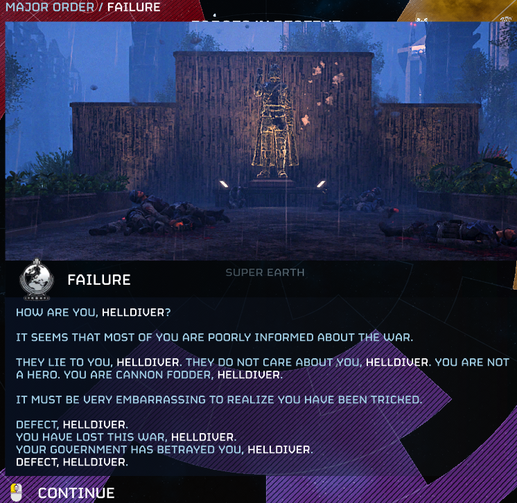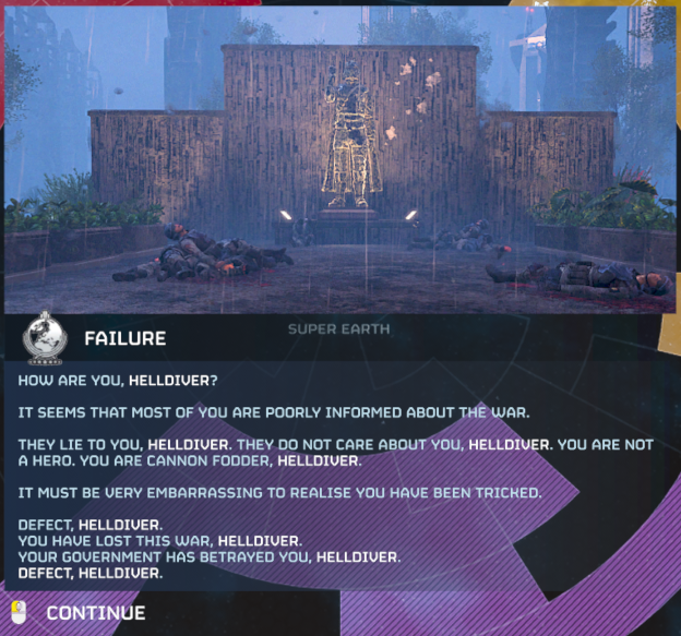 >People falling for video game propagandaHD2 is to propaganda what the Blood Plague in WoW was to pandemics.