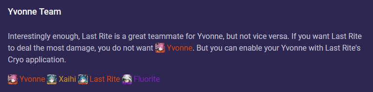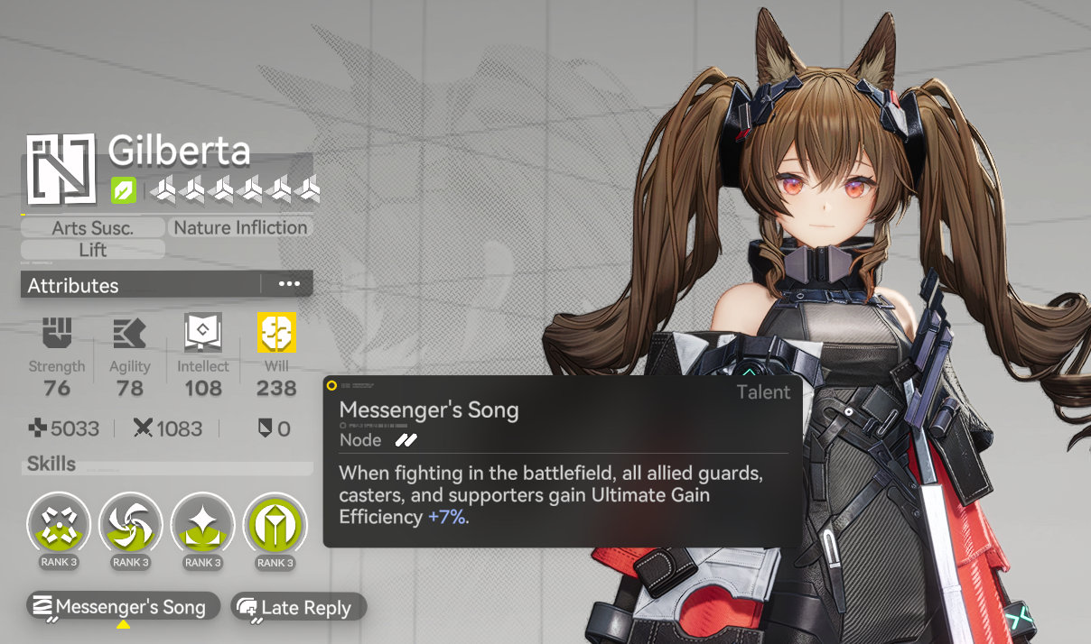>>556750598I like her theme and design, but I really do not like her gameplay.Basically her skill is not an "instant use skill" like most characters, it gives your on-field character a short duration buff that upgrades the finisher of its auto-attack chain, allowing it to deal bonus ice damage and add a cryo stack.The goal is to get at least 3 cryo stacks on target because it then triggers her combo attack, which is a mini-nuke, but it's a pain in the ass because there aren't that many characters actually spreading cryo stacks in the first place like there are physical characters spreading Vulnerability i.e which is much easier to come by.I keep losing the buff because bosses keep moving around or attacking which interupts my on-fielder attack chain, so I can't drop a finisher, so LR's buff is wasted and disappears before I got to use it, thus wasting all the SP that was used to cast it in the first place.0/10 would not recommend. She's cute though.