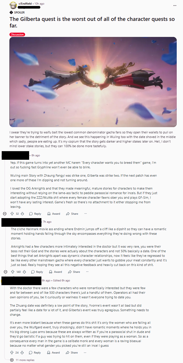 Previous thread: >>556727701>Official Websitehttps://endfield.gryphline.com/en-us>Official EN X (News)https://x.com/AKEndfield>DEV Comm (Developer Updates)https://endfield.gryphline.com/en-us/news/3846>Gilberta PV'shttps://www.youtube.com/watch?v=8hZVxeiSmQ4 - EP [Snap Shot]https://www.youtube.com/watch?v=BQom1V9TdbM - Operator Storyhttps://www.youtube.com/watch?v=h70w5ZmXLkE - Combat Demo>Chartered Headhunting ScheduleFebruary 7th to February 24th --- "The Floaty Messenger", (Gilberta)February 24th to March 13th --- "Hues of Passion", (Yvonne)TBA>Reward CodesENDFIELDGIFTENDFIELD4PC>Twitch Dropshttps://endfield.gryphline.com/special/third-party-binding?channel=twitch>Voyage to the Stars (Ongoing until March 4th)https://endfield.gryphline.com/activity/voyage-to-the-stars/en-us/>Wikishttps://wiki.skport.com/endfield (Official)https://perlica.moehttps://warfarin.wiki/enhttps://endfield.wiki.gg/>Blueprint Guideshttps://talospioneers.com/en>Stickershttps://drive.google.com/drive/folders/13KH3L6QPIKkVH7pBddv4uxwmwJsnOtklhttps://drive.google.com/drive/folders/1OuVtjv1k-9c3M6n7d4PX3CGG5bkwH04ahttps://drive.google.com/drive/folders/1AStB8bzFk3lSwMwczWPkFYCBrZe0vHOghttps://drive.google.com/drive/folders/1yS0lqUhxf8tBRtpDFfCU1y16IS2sSeF7>Fr/end/sSubmit your info, /end/min:https://forms.gle/Fo7BhZMKaKqiWyL19View other /end/mins:https://docs.google.com/spreadsheets/d/1YtxiDss0hgEQhLlZgpfzyGrJrzUcqDzOS9T6IH-BiVc/edit?usp=sharing