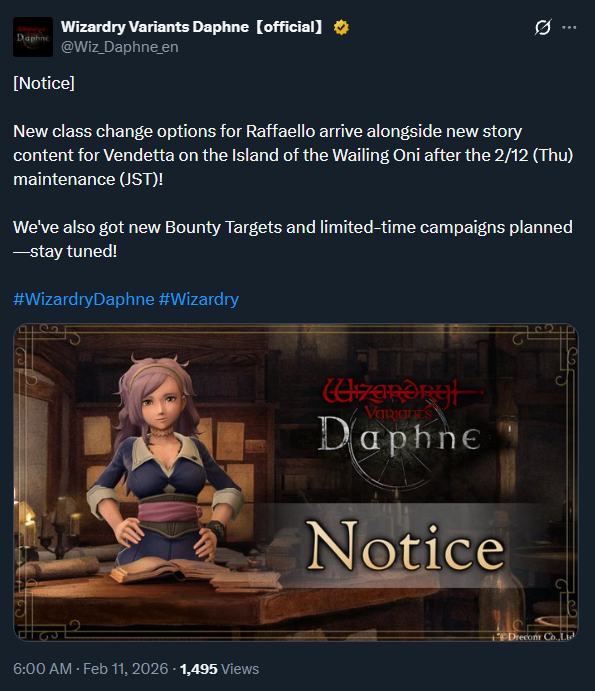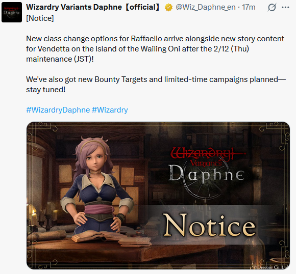 At Pub Edition>Current Featured Adventurer Banners:Flameblade of Revolt, Yoizou - Until 2/24>Current Reminiscence Adventurer Banners:Raffaello - Until 2/19>Wizardry Variants is available on Android and Steam:https://store.steampowered.com/app/2379740/Wizardry_Variants_Daphne/https://play.google.com/store/apps/details?id=jp.co.drecom.wizardry.daphne>Current Events/New Content:[Free Gems] 200 gem code in webstore - YJseQZA8dJ[New Quest] Island of the Wailing Oni[New Samurai Weapon type] Odachi[New Remains] Adventurers Remains II[Legendary Quest] GerardFREE 800 Gems of Org (one time) + 50 per week on their official web currency store: store.wizardry.info[Japanese VPN only] ANOTHER FREE 800 Gems of Org (one time) + 50 per week: webstore.wizardry.info/product>Fanguides:https://wizardry.fasterthoughts.io/ - (EN)https://gamerch.com/wizardry-daphne/ - (JP)>General Information:https://rentry.org/x5xxitrz>Tavern/Camp choices:https://rentry.org/2gngvv2n>Friend Code:https://rentry.org/SavoryRisk>I.V checker and Other Stat Calculators:https://wizardry-daphne.mcwild.net/init_status/>In-depth Gacha Rateshttps://wizardry.info/daphne/gacha_rates/en/characters.htmlhttps://wizardry.info/daphne/gacha_rates/en/equipments.htmlPrevious thread: >>556212862
