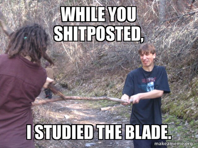 >>557168749>Virgin ninjaGay knives, gay throwing knives, 1 katana>Chadmurai1 katana, 1 BIG katana