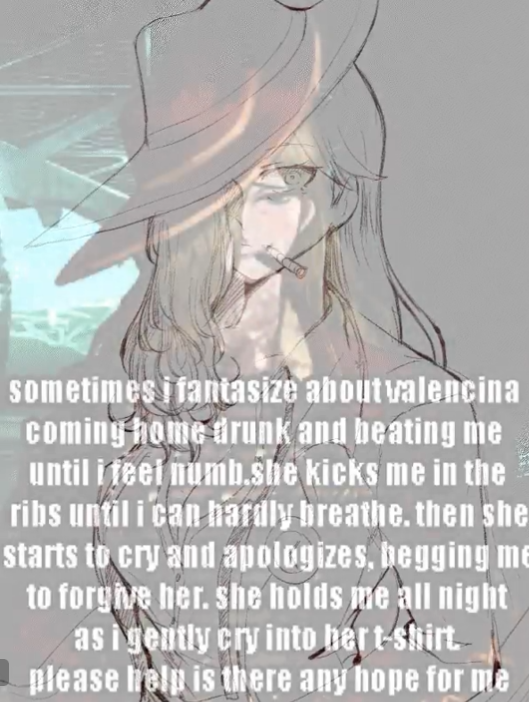 >>556768901The mirror world version of Valencina who took me in instead of the bum Lucio is currently alive as a reinstated Thumb Capo and my wife