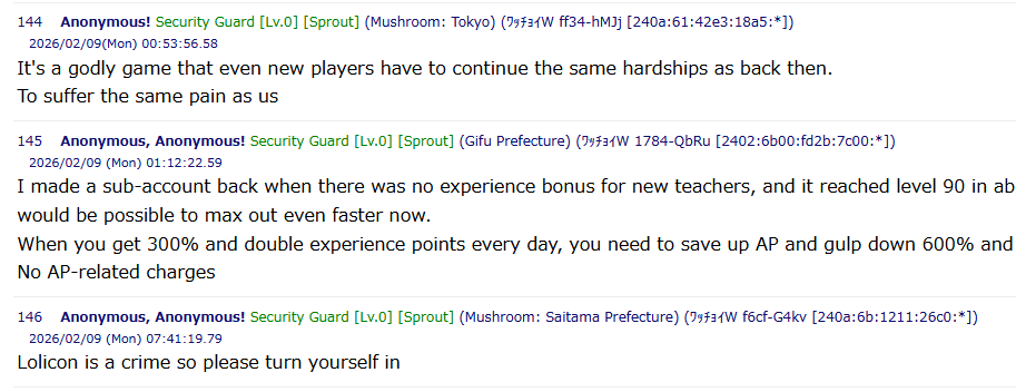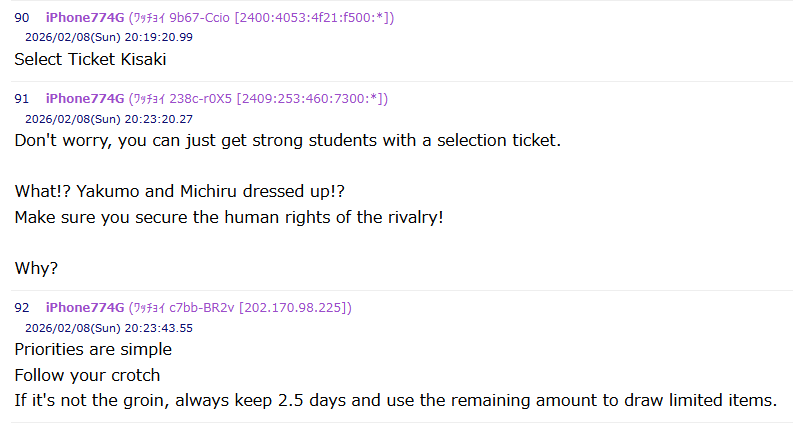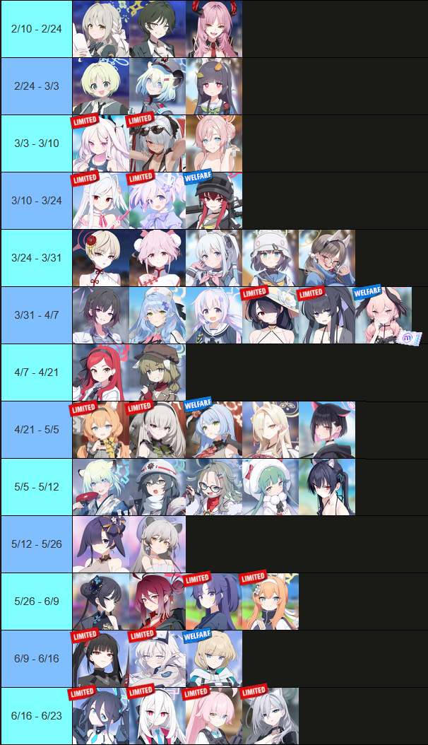 Previous thread: >>556721378>Guides, Resources and useful links:https://rentry.org/bagguides>/bag/Circles/Clubs/Friends:https://rentry.org/holdingthebag>4koma, Manga, Side Content, PVs & Shortshttps://rentry.org/bacontent>>(JP) – JST>Banners:>2/5 After Maint – 2/12 10:59IchikaKasumiSakurakoEimi (Swimsuit)>News:Patch notes: https://bluearchive.jp/news/newsJump/624>Events:Steel Continent Assault: Malkuth Battle – 1/29 After Maint – 2/12 10:595th Anniversary Login Bonus – 1/20 After Maint – 2/12 10:59>Content:Limit Break Assault: Chokmah (Field w/Special Armor) – 1/21 11:00 – 2/12 3:593x Commission/Lesson – 2/5 4:00 – 2/12 3:592x Account EXP – 2/7 4:00 – 2/9 3:59>>(GLOBAL) – UTC>Banners:>1/27 After Maint – 2/10 1:59Misaki (Swimsuit)Saori (Swimsuit – Limited)Hiyori (Swimsuit – Limited)Neru (Bunny – Limited)Karin (Bunny – Limited)Akane (Bunny)>News:Patch notes: https://forum.nexon.com/bluearchive-en/board_view?thread=3355429>Events:Sheside outside – 1/27 After Maint – 2/10 1:59The Arius District's Emergency Class Mission – 2/3 2:00 – 3/10 1:59My Office: https://bluearchive.nexon.com/user/myoffice>Content:Grand Assault: Chesed (Field – Torment w/Elastic Armor) – 2/3 2:00 – 2/9 18:59Limit Break Assault: Chokmah (Field – w/Special Armor) – 1/14 2:00 – 2/9 18:592x Commissions/Hard – 2/2 19:00 – 2/9 18:592x Bounty/Scrimmage – 2/9 19:00 – 2/16 18:592x Account EXP – 2/13 19:00 – 2/15 18:592x Normal – 2/16 19:00 – 2/23 18:592x Account EXP – 2/20 19:00 – 2/22 18:59