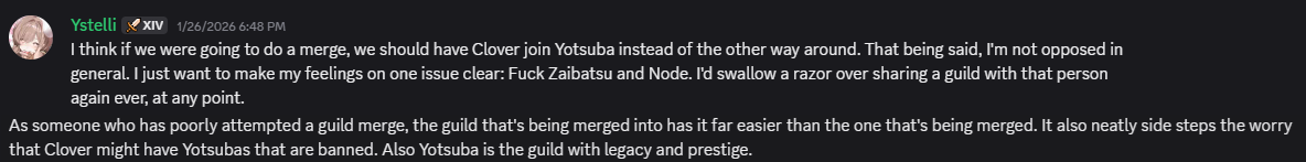 >>556768008>>556768406>>556768698Yotsuba is the only true thread guild left.Zaibatsu was a cliqued shithole from the start and Clover lost their mandate when they started blacklisting anons from joining.