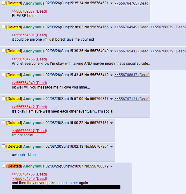 >>556766179it's cute as long as it doesn't feel like i'm pulling teeth to get you to talk to methe line between "anon is shy" and "oh, anon is uninterested" is very easy to fuck up