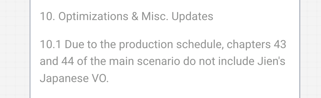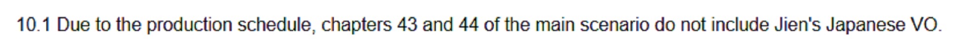 >>556804274>Due to the production schedule, chapters 43 and 44 of the main scenario do not include Jien's Japanese VO.