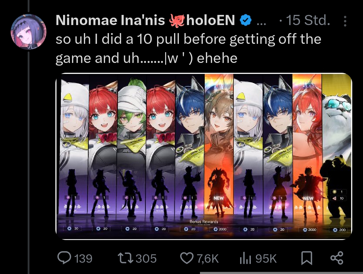 >Endfield only cares about profit and copying Hoyo, which is why they took the perfectly profitable Hoyo gacha system and changed it to filter out hoyofags>Hypergryph is too lazy to model low rarity characters in a 3D gacha which is why they removed weapons from the banners and made them character only with a brand new tier of low rarity characters that doesn't exist in the Hoyo games they're supposedly copying>Every single new character is going to be a 6* because that's the only thing that's profitable, which is why dupes in this game are fucking useless and give players zero incentive to spend any money on themHang all these retarded fucking armchair CEOs.