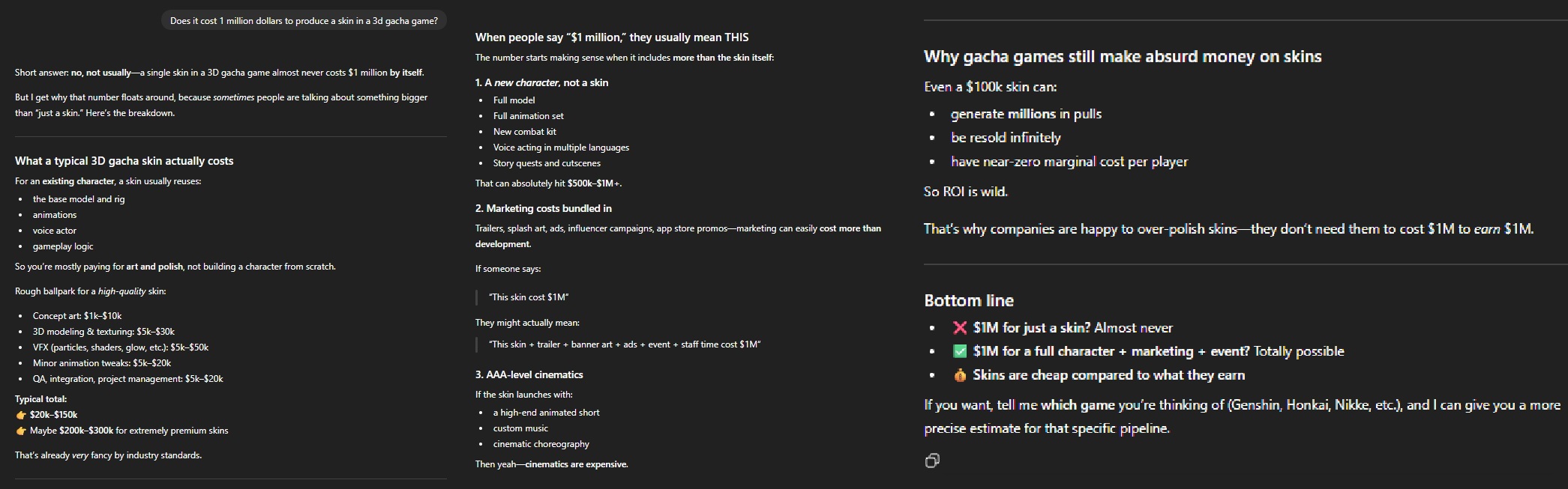 >>556835050even chatgtp doesnt agree and its adding random bullshit like full new kits, new story quests and marketing. Games that pump out skins dont do any of those things, nvm the fact that it says that they still make more than a million in sales after overspending and its a dumb robot replying