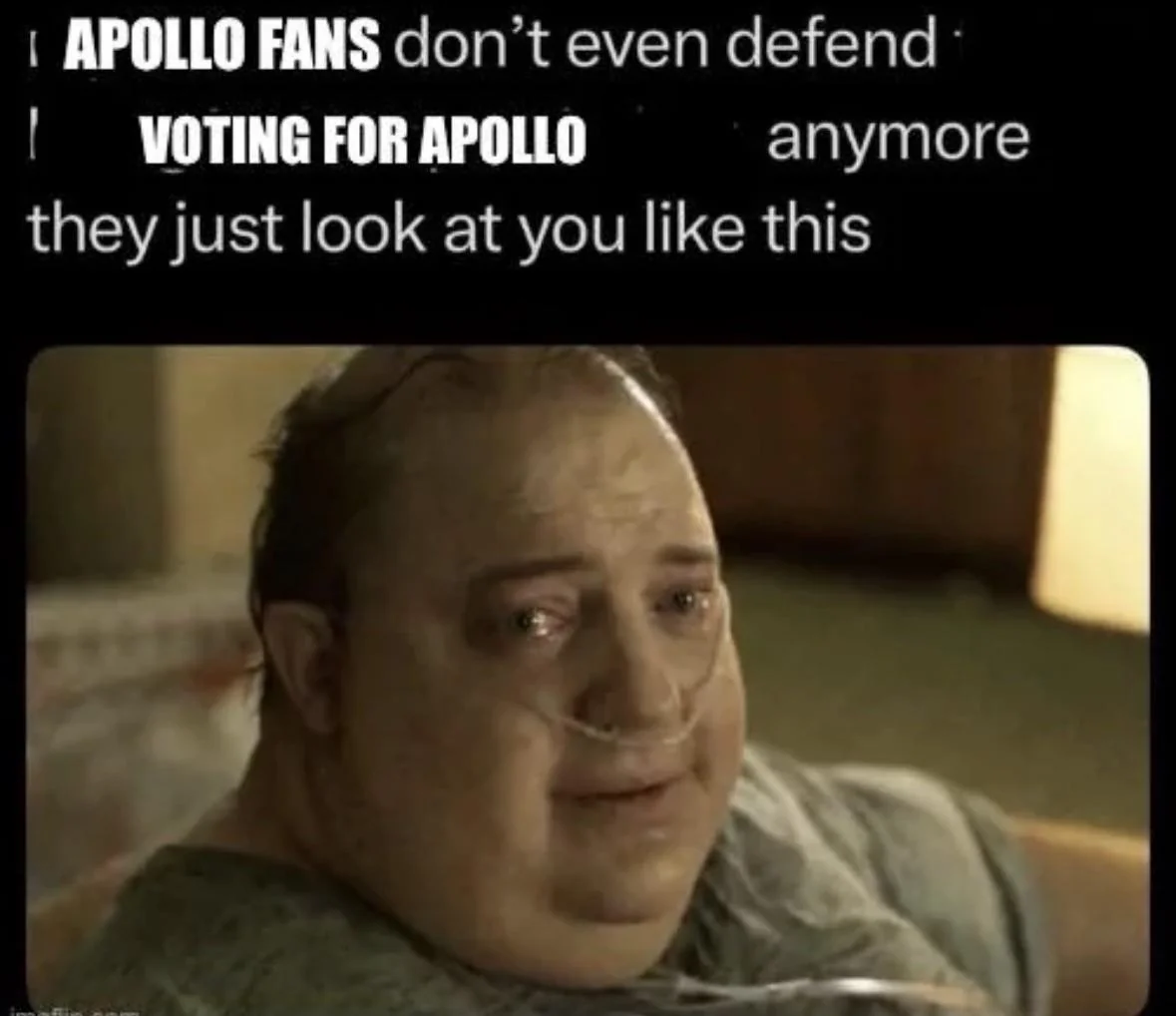 Apollochuds.....................we should... agh.... *cough*we should've......we should've... actually voted for.... Apollo....instead of....... posting gifs.... *cough* in... #apollo all day...*gurgle*