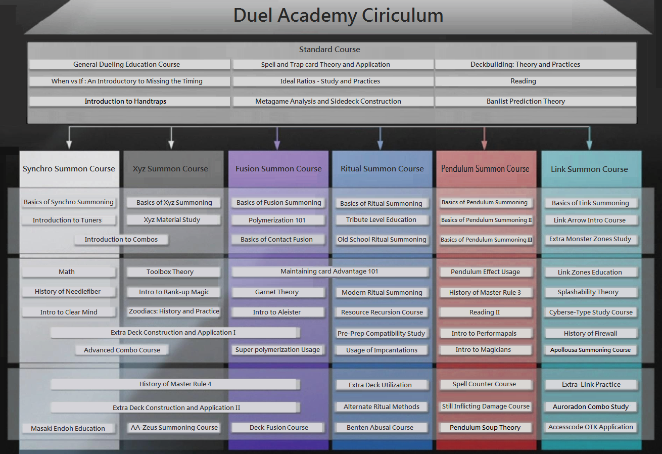 >>556871730>at least 3 courses in the Link field are totally dead >The Pendulum field is also pointless to study Kek. Also the Fusion field needs courses dedicated to HERO, Shaddoll, Branded, Dracotail and Tears while the Synchro field needs courses on Zombie and Plant loops with extra credit courses on one card synchro theories and Xyz needs a course on K9 Civics.Duel Academy would be totally loaded if GX was made in 2024.