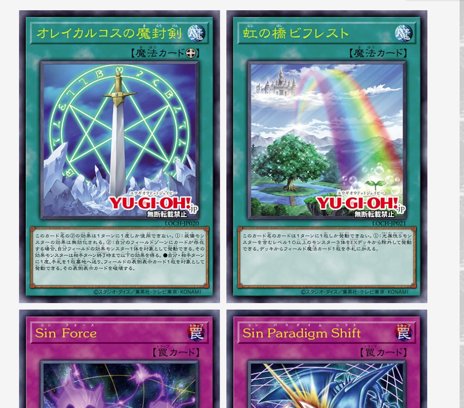 Sealing Sword of OricalchosEquip SpellNegate the equipped monster's effects. If you have a card in your Field Zone: You can target 1 Effect Monster you control; it gains the following effect until the end of your opponent's next turn.● Once per turn (Quick Effect): You can send 1 card from your hand to the GY, then target 1 face-up card on the field; destroy it.You can only use this effect of "Sealing Sword of Oricalchos" once per turn.Rainbow Bridge BifrostNormal SpellBanish 3 Level 10 or higher LIGHT Synchro Monsters from your Extra Deck; add 1 Field Spell from your Deck to your hand. You can only activate 1 "Rainbow Bridge Bifrost" per turn.Malefic ForceNormal TrapTarget 1 face-up monster on the field; equip this card to it as an Equip Spell with the following effects.● The equipped monster is unaffected by Spell Cards and effects.● Once per turn: You can destroy this card, and if you do, add 1 "Malefic" card from your Deck to your hand.If there is a card in your Field Zone: You can banish this card and 1 "Malefic" card from your GY; destroy all monsters on the field. You can only use each effect of "Malefic Force" once per turn.