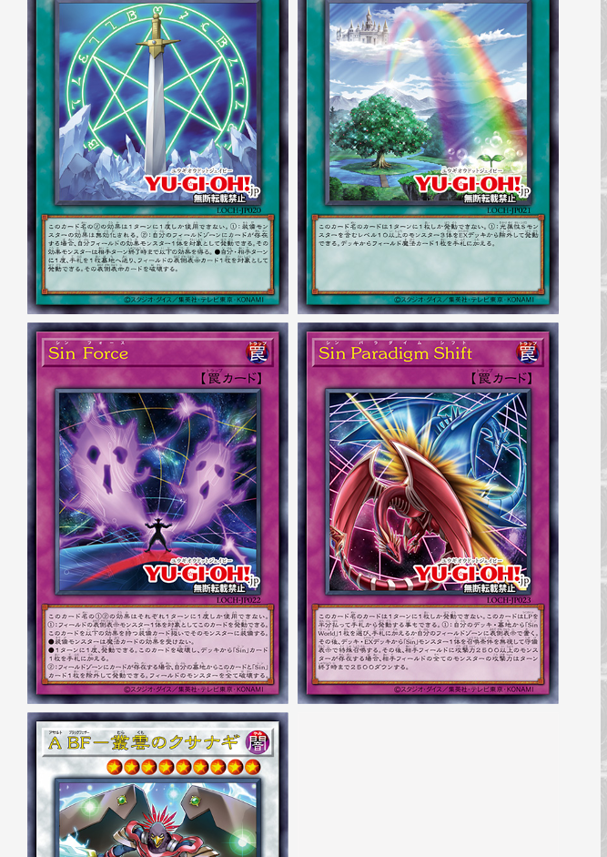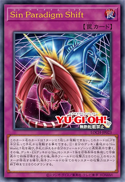 Sin ForceEach of the effects and of this card name can only be used once per turn.: You can activate this card by targeting 1 face-up monster on the field.Equip this card to that monster as an Equip Card with the following effect:The equipped monster is unaffected by the effects of Spell Cards.Once every 1 turns, you can destroy this card and add 1 "Sin" card from your Deck to your hand.: If there are cards in the Field Zone, you can banish this card and 1 "Sin" card from your Graveyard; destroy all monsters on the field.Sin Paradigm ShiftYou can only activate 1 card with this card name per turn. This card can also be activated from your hand by paying half your LP. 1: Select 1 "Sin World" card from your Deck or Graveyard and add it to your hand or place it face-up in your Field Zone. Then, Special Summon 1 "Sin" monster from your Deck or Extra Deck in Defense Position, ignoring its Summoning conditions. Afterwards, if your opponent controls a monster with 2500 or more ATK, reduce the ATK of all monsters on your opponent's field by 2500 until the end of the turn.Assault black feather Murakumo ABF-Murakumo Kusanagi[Winged Beast/Synchro/Effect]Tuner + 1 or more non-Tuner monsters: This card, when Special Summoned using a "Blackfire" monster as material, is treated as a Tuner. : When this card is Special Summoned, this effect applies. Until the end of this turn, this card's ATK increases by the combined original ATK of the Special Summoned monsters used as material. : This card can attack each of your opponent's monsters once, and if it attacks a Defense Position monster, it inflicts battle damage to your opponent equal to the difference between its ATK and the DEF of that monster.ATK/3000 DEF/1000