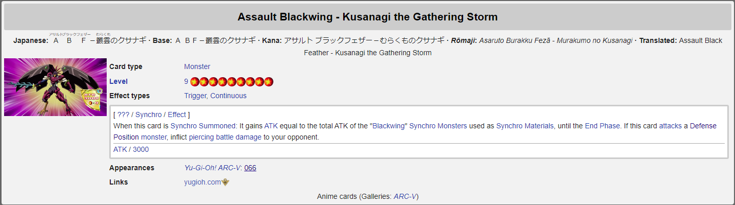 Assault Blackwing - Kusanagi the Gathering Storm1 Tuner + 1 or more non-Tuner(1) If this card is Special Summoned using a "Blackwing" monster as material, it is treated as a Tuner.(2) If this card is Special Summoned this card gains ATK equial to the combined ATK of the Special Summoned monsters used as material until the end of the turn.(3) This card can attack each of your opponent's monsters once and if it attacks a Defense position monsters inflict battle damage to your opponent equal to the difference between its ATK and the DEF of that monster.