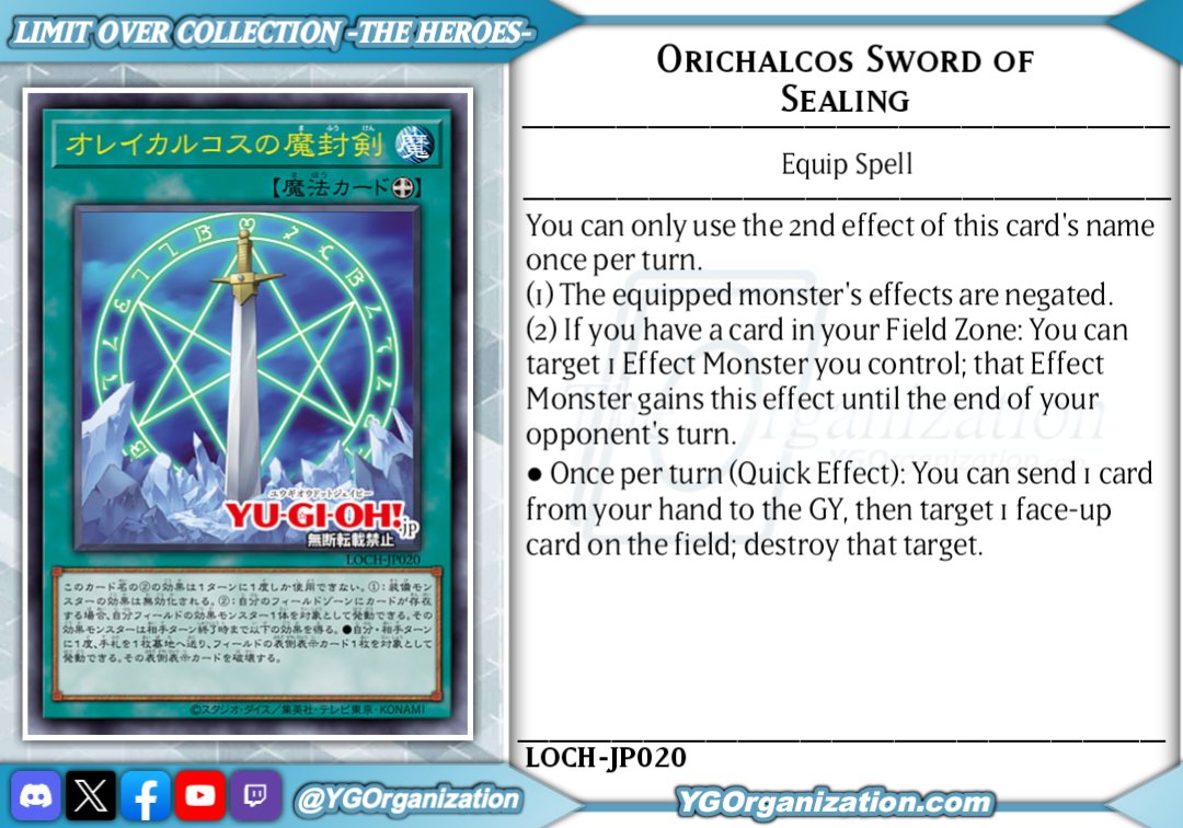 Orichalcos Sword of SealingEQUIP SPELL CARDYou can only use the following effect (2) from this card's name once per turn.(1) A monster equipped with this card has its effects negated.(2) If a card is in a Field Zone: You can target 1 Effect Monster you control; that target gains this effect until the end of your opponent's turn.*Once (Quick Effect): You can send 1 card from your hand to the GY, then target 1 face-up card on the field; destroy that target.