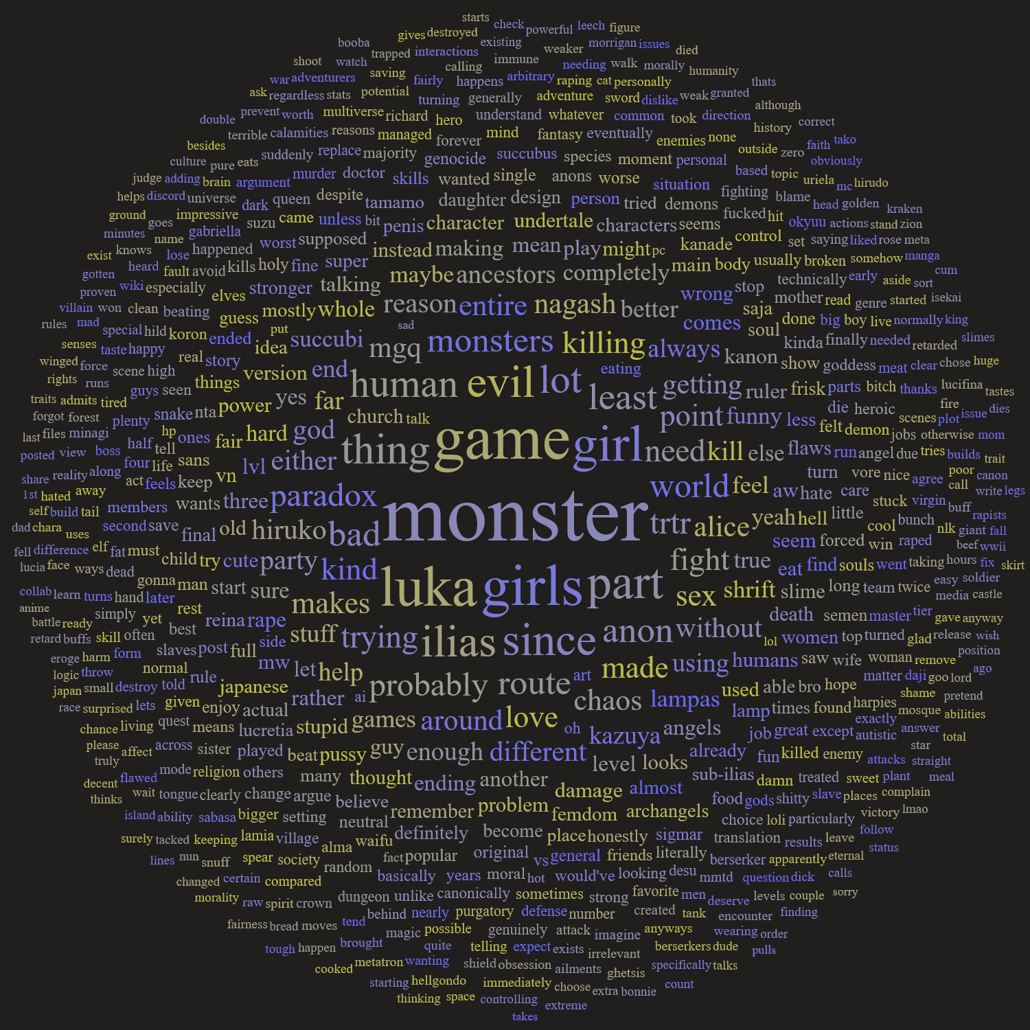 Luka took my human wife which I was in a happy and fulfilling marriage with and saddle me with a monsterwhore in her stead while the human wife is forced into hard penal labour farming and mining. Fuck that eggplant-haired brat.