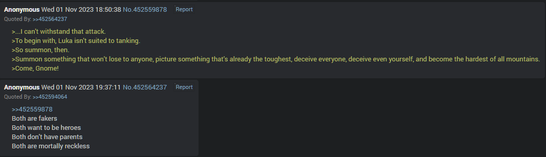>>557631849you saying it's a common joke in anime, and not just a common joke that happens everywhere in general. If you don't find the joke funny that's fine but it's not something to get all 'this isn't healthy' about. It's pretty harmless is all.>>557614878Counterpoint>"Mer"maids>They are MerchantsIt was right in front of you all along....>>557614997Leave VN!Port Natalia out of this! It's not the postgame's fault that some ruinous calamity corrupted that place with some kind of mind virus! Luka will fix it!Also El/Laura/Bonnie/Ashel/etc don't do anything either, since they were with Luka the whole time, they didn't drink the chaos water.