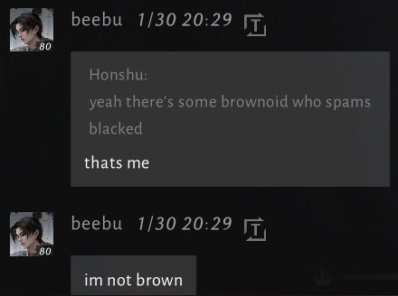 >>557031536>By being the person who actually looks at what's happening each game because I'm the only one willing to talk strategyYou keep bringing up this chestnutMaybe you should ask yourself why people are so reluctant to discuss this stuffOr why its even relevant when people are literally trying to discuss this stuff right now you turboautist. Effortposting just to have you accuse them of being 40IQ beebu or enemy guilds come here to sabotage our killer stratsGet a grip, we'll continue this later.