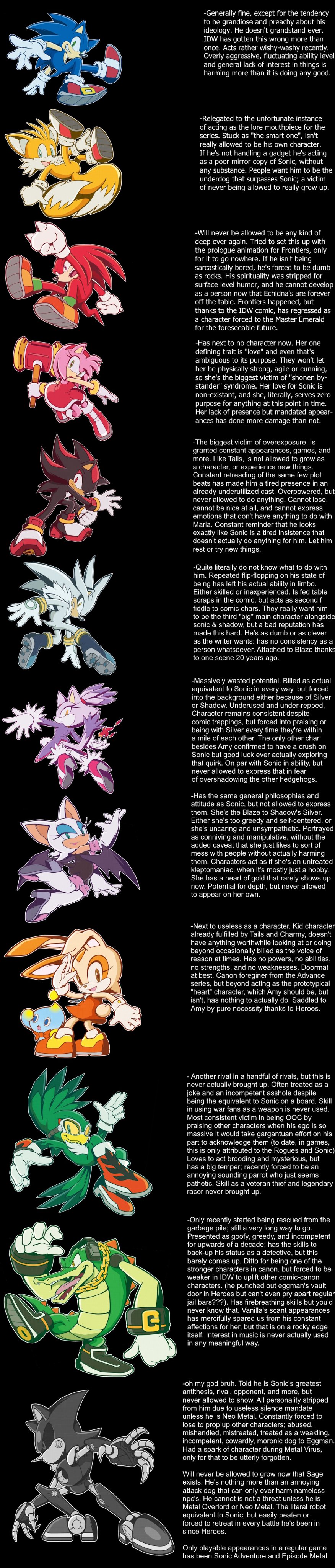 >>556928284>I'd believe all that if you then made Marine Blaze's AmyMarine is just a copy of Amy reverse-engineered from what a Nega-Tails would be, and thus, Amy is the true Nega-Tails. Marine only exists to fill a space that is ultimately unneeded, and her dynamic with Blaze is not substantially different from what Blaze would have with Amy anyway. It's entirely possible that Sonic Rush could have just paired Blaze with Amy, and then brought Amy to Blaze's World with Sonic & Tails, and Marine would never have existed at all. Similarly, if Sonic Rush Adventure went out of its way to create a "Nega-Knuckles" for Blaze, that would be a Rouge clone. And that character would be made redundant just by having Blaze and Rouge directly interact. I don't want to give the wrong impression, though, I like Marine and wanna see her appear more, I'm just analyzing how all these characters connect on a conceptual level and where things naturally fit. Like even Tails being "Boy Blaze" fits just from cross-referencing Blaze to Sally. Sally, by being the Nega-Sonic in SatAM, is apparently a tech-genius or whatever. Sonic is impulsive and street smart, so "Nega-Sonic" is a book-smart genius of some kind. One of the first character dynamics I'd think of as an example is just Ben & Gwen Tennyson, where Gwen is just Sally + Blaze to Ben's Sonic, and -her- character is just being a nerd compared to him. But like a girl nerd who thinks she's better than you 'cause you're just a dumb boy or whatever.Blaze has a more logical mind compared to Sonic, but in her case the Tails similarity is her background of being bullied causing her to be timid and socially withdrawn despite being a princess. Like, it feels like the idea of Tails is just the equivalent of Amy to Sonic.Both Tails & Amy have the "younger than-" aspect built into their character. Amy being Sonic's "junior" in the sense of an anime girl obsessing over her "senpai", Tails is the inverse of that for Blaze in some way.