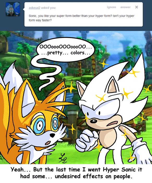 >>556927146Super Emeralds are the Super Chaos Emeralds. >>556927406>Marine while equally outgoing is forced to be the follower because when the going gets tough she would hide under Blaze's legs which Amy wouldn'tWould Marine really, though? I don't see it that way. Marine is the one who'd declare herself "Captain" and believe Blaze is -her- follower. Because that's how a Nega-Tails would think, and Amy is just as dominant towards Blaze in that regard.A Nega-Tails would be the one insisting that Nega-Sonic open up more or whatever.>>556927406>No, it's their Emeralds,Their Emeralds have the same dynamic Sonic & Blaze do, so that doesn't make sense. The link would have to be one thing that's an actual mid-point. The Emeralds aren't the mid-point because they themselves are like polar opposite magnetic stuff. The midpoint is the one(s) going after the Emeralds, drawing Sonic & Blaze to intersect. That's Eggman. >>556927406>o, because Marine isn't an equal to Silver and Blaze like Amy would be treated as.Marine is built off of Rush!Tails, so she doesn't get to do anything but blast the Water Ball thing in that one cutscene the same way Tails doesn't get to do anything. If Marine -was- allowed more agency, she'd be just as active and independent as Amy herself is, and assert herself as an equal even if she's absolutely not in anyone else's eyes. The whole story was her asserting herself as the captain but no one gave her any respect and thought it'd be best if she stayed behind. But, she refused, and kept asserting herself anyway until they -did- respect her. Because that's how Amy, that's how a Nega-Tails, would operate.A Nega-Tails mindset is "I AM good enough and I will MAKE them respect me", and that's Amy's mindset in SA1, and Marine's mindset in Rush Adventure.