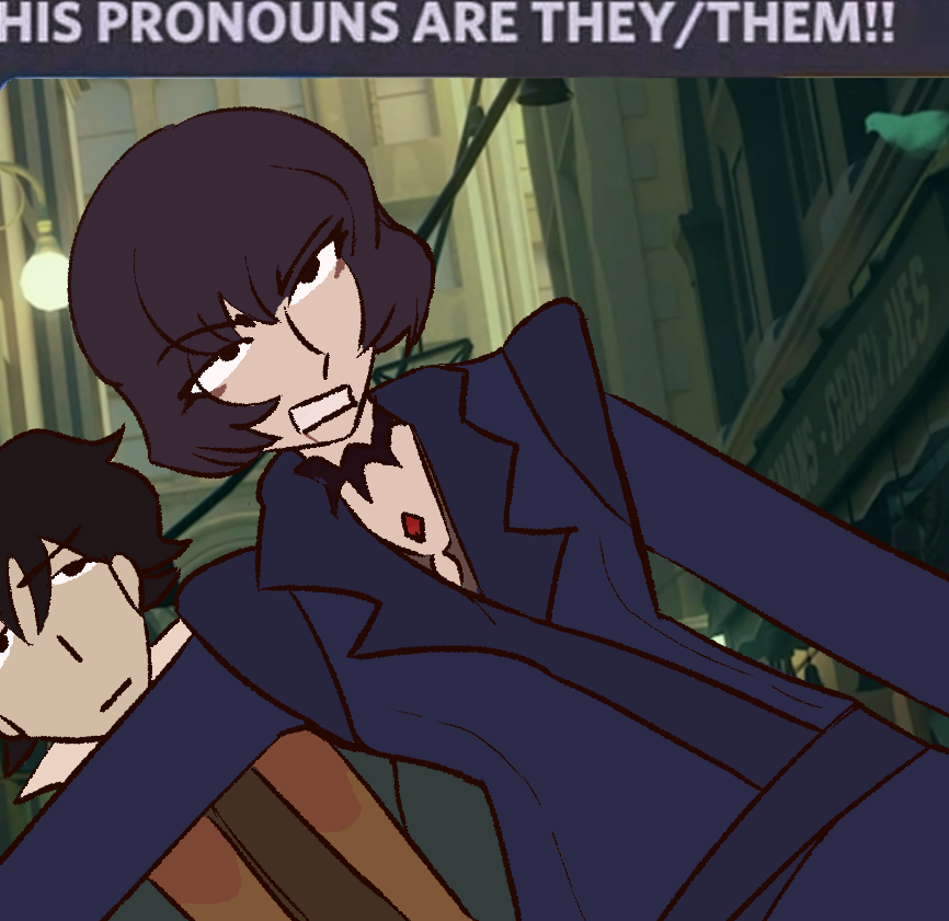 >>556893408Yeah, nobody cares, it's always androgynous male characters that get they/them'd too because the only people that give a shit about this are self-hating fujo-pooners that want to self insert as androgynous male characters.