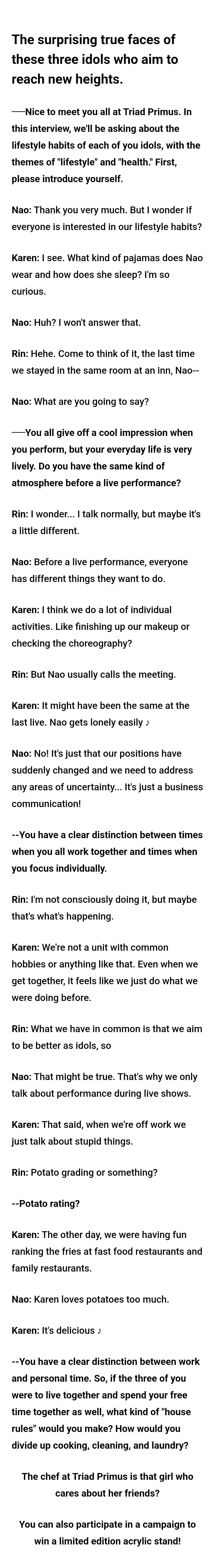 Just read all of the interviews. Nothing too interesting production wise. It's a little interesting if you want to read impressions of each other but that nothing that gets past lipservice.They did remember to shill the live later this month so I'm now wondering what they actually have planned since they barely mentioned it in this month's HR live too.