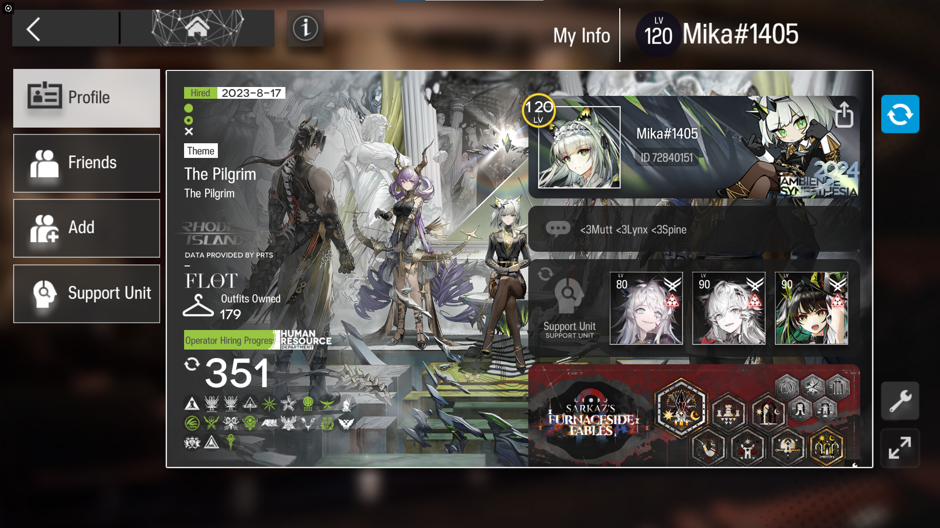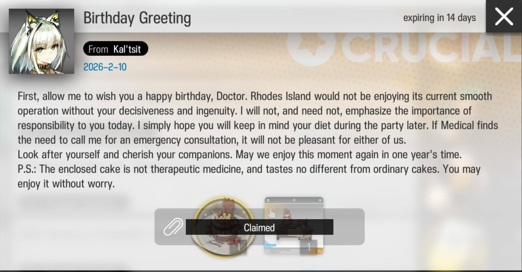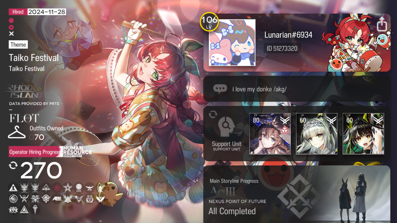 Previous thread: >>556911394>CURRENT, FUTURE GLOBAL/JP/KR CONTENT:[1/30-2/13][Standard]6* Vanguard Vulpisfoglia, 6* Caster Goldenglow (Shop), 5* Caster Tecno, 5* Vanguard Surfer, 5* Defender Firewhistle (Shop)[1/16-2/13][Marthe, Coral Coast & Misaligned Sightseer]Thorns the Lodestar, Ch'en the Holungday, Necrass, May, Pepepipi[2/3-2/17]Duel Channel: Honeydew[2/3]Holographic Combat Matrix[2/10-2/24]AK x BanG Dream! Ave Mujica: Somniloquium Serenum - 5* Guard Nyamu Yuutenji & 5* Specialist Umiri Yahata[2/10-2/24][Cantilena Puppae]6* Guard Sakiko Togawa, 5* Supporter Uika Misumi, 5* Specialist Mutsumi Wakaba[2/10-3/3][Crossover]Sakiko Togawa, Uika Misumi, Mutsumi Wakaba, Nyamu Yuutenji, Umiri Yahata>CURRENT, FUTURE CN CONTENT:[1/29-2/12][Standard]6* Caster Blaze the Igniting Spark, 6* Vanguard Ines (Shop), 5* Medic Paprika, 5* Medic Nowell, 5* Specialist Spuria (Shop)[2/3-3/3]Reselling a bunch of skins[2/10-3/3]First of A Thousand Autumns - 5* Sniper Ju[2/10-2/24][Ashes to Ashes, Ages on Ages]6* Specialist Wang, 6* Guard Ch'en the Dawnstreak, 5* Medic Taraxacum[2/10-3/10][0011]Dusk, Ling, Yu, Philae, Surfer[2/14-2/28][Unveiling of Devotion]Breeze, Beanstalk[2/14-2/28][Unveiling of Devotion Re-Edition]Nightmare, Hibiscus the Purifier; Harmonie, Arene>/akg/ website:akgcc.github.io>AK EN Database:puppiizsunniiz.github.io/AN-EN-Tags/akhrchars.html>More valuable resources:rentry.org/akg_resources>/akg/ merch guiderentry.co/akg_merch