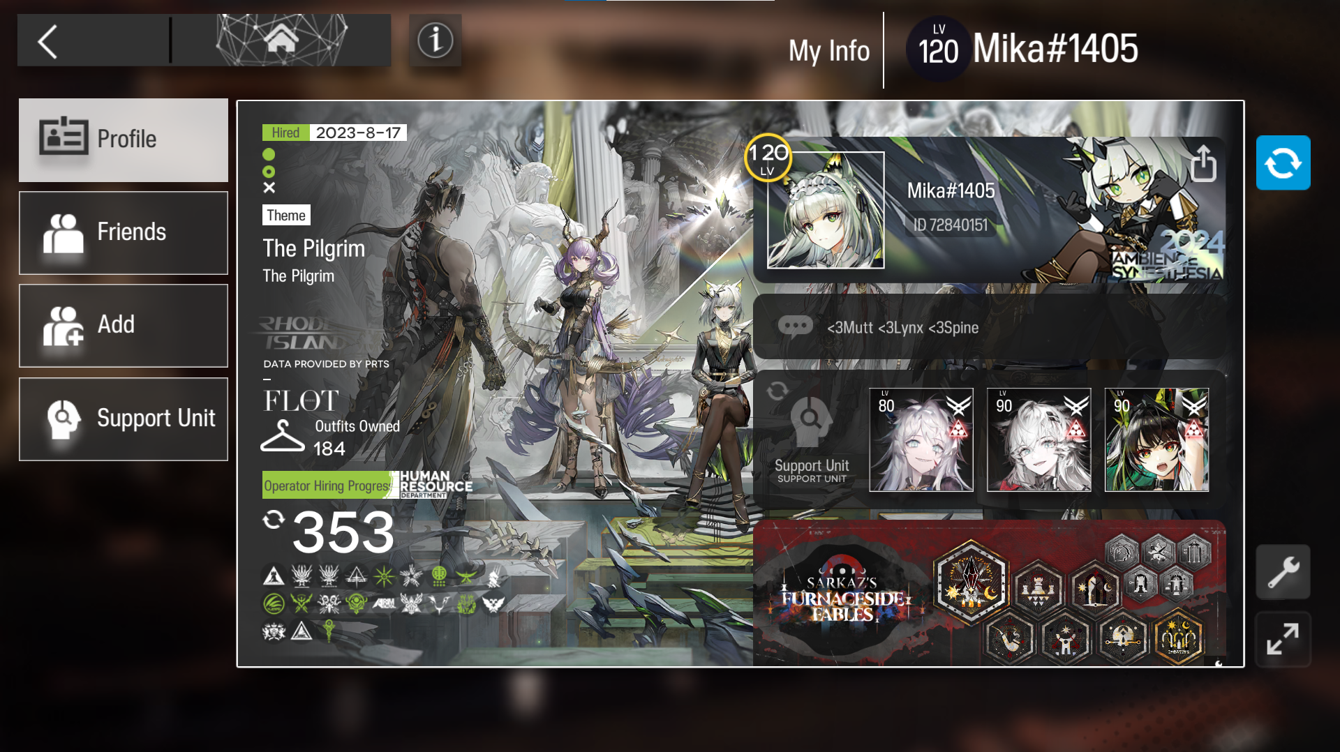 Previous thread: >>556938125>CURRENT, FUTURE GLOBAL/JP/KR CONTENT:[1/30-2/13][Standard]6* Vanguard Vulpisfoglia, 6* Caster Goldenglow (Shop), 5* Caster Tecno, 5* Vanguard Surfer, 5* Defender Firewhistle (Shop)[1/16-2/13][Marthe, Coral Coast & Misaligned Sightseer]Thorns the Lodestar, Ch'en the Holungday, Necrass, May, Pepepipi[2/3-2/17]Duel Channel: Honeydew[2/3]Holographic Combat Matrix[2/10-2/24]AK x BanG Dream! Ave Mujica: Somniloquium Serenum - 5* Guard Nyamu Yuutenji & 5* Specialist Umiri Yahata[2/10-2/24][Cantilena Puppae]6* Guard Sakiko Togawa, 5* Supporter Uika Misumi, 5* Specialist Mutsumi Wakaba[2/10-3/3][Crossover]Sakiko Togawa, Uika Misumi, Mutsumi Wakaba, Nyamu Yuutenji, Umiri Yahata>CURRENT, FUTURE CN CONTENT:[1/29-2/12][Standard]6* Caster Blaze the Igniting Spark, 6* Vanguard Ines (Shop), 5* Medic Paprika, 5* Medic Nowell, 5* Specialist Spuria (Shop)[2/3-3/3]Reselling a bunch of skins[2/10-3/3]First of A Thousand Autumns - 5* Sniper Ju[2/10-2/24][Ashes to Ashes, Ages on Ages]6* Specialist Wang, 6* Guard Ch'en the Dawnstreak, 5* Medic Taraxacum[2/10-3/10][0011]Dusk, Ling, Yu, Philae, Surfer[2/14-2/28][Unveiling of Devotion]Breeze, Beanstalk[2/14-2/28][Unveiling of Devotion Re-Edition]Nightmare, Hibiscus the Purifier; Harmonie, Arene>/akg/ website:akgcc.github.io>AK EN Database:puppiizsunniiz.github.io/AN-EN-Tags/akhrchars.html>More valuable resources:rentry.org/akg_resources>/akg/ merch guiderentry.co/akg_merch