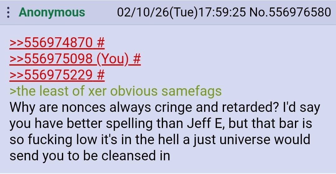 >>556974870>>556975098>>556975229>the least of xer obvious samefagsWhy are nonces always cringe and retarded? I'd say you have better spelling than Jeff E, but that bar is so fucking low it's in the hell a just universe would send you to be cleansed in