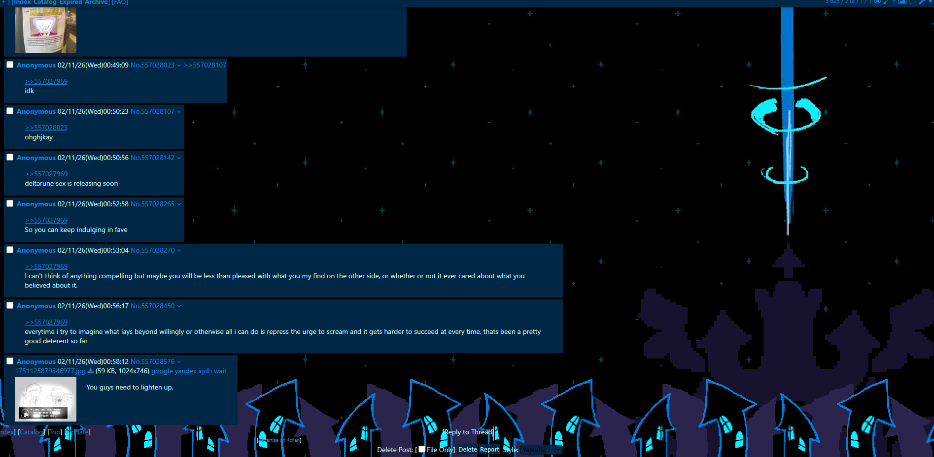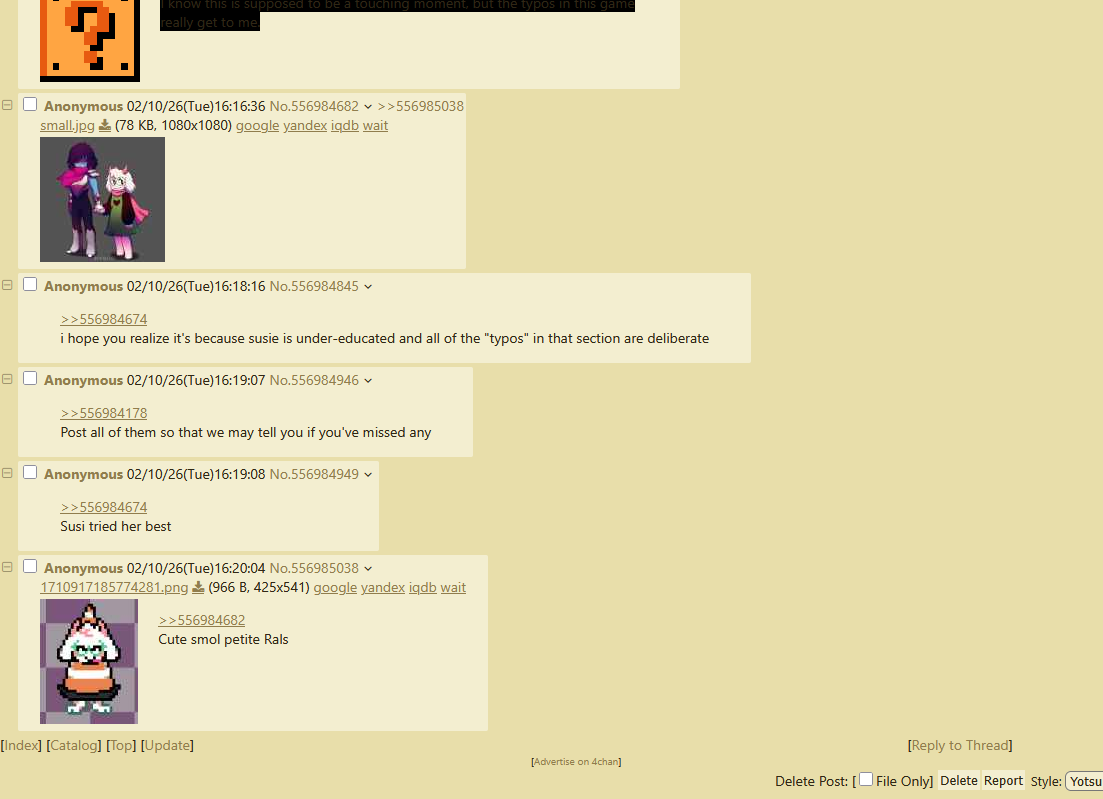 Advanced pacifism editionPrevious peacekeeping: >>556890263 Spoilers ahead, proceed at your own Frisk.-DELTARUNE CHAPTER 1-4>https://store.steampowered.com/app/1671210/DELTARUNE/-The Old Game>https://undertale.com-The Old Game's Demo>https://undertale.com/demo-The New Game>https://deltarune.com-The New Game's Progress>https://toby.fangamer.com/newsletters/winter2025/>https://toby.fangamer.com/newsletters/>https://deltarune.com/#news>https://www.twitlonger.com/show/n_1sqn3p9-Merch>https://www.fangamer.com/collections/undertale>https://www.fangamer.com/collections/deltarune-Books-Undertale Artbook>https://pastebin.com/1MRmU0Gk-Legends of Localization - Undertale>https://pastebin.com/DkZaXMpi-Extra Content>https://undertaleqa.tumblr.com>https://undertale.com/alarmclock>https://deltarune.com/sweepstakes/>https://toby.fangamer.com/newsletters/-Undertale/Deltarune Text Dumps & Screenshots>https://pastebin.com/WG9u1fvH-Undertale Image Collections>https://pastebin.com/g2JqH6Ba-Booru>https://utg.vidya.pics/-Recommendbin>https://pastebin.com/fsqd5Sa6-Writebins>Current: https://docs.google.com/document/d/1ZaYVvltQ_Rmf-ggszf1bwmYDW2NUcfpTYU7JzfyMhVE>Old: https://writebin.surge.sh-Comicbin>https://pastebin.com/UJpBYSEE-Fangamebin>https://archive.is/iSiFg-/vg/ League team>https://implyingrigged.info/wiki//utg/-Wanna change the font?>https://rentry.org/utg-font-Current whiteboard: https://r2.whiteboardfox.com/25441542-9711-2728-Previous whiteboard: https://r9.whiteboardfox.com/95752650-3128-2361-Current Magma: https://magma.com/d/3B5chWd0Vh-Previous Magma: https://magma.com/d/QiFH9rWyRh-WorldOfText: https://ourworldoftext.com/utg-Pippins Wiki>https://utg-pippins-ocs.neocities.org-Thread Template (make sure to paste the current whiteboard links)>https://pastebin.com/rTN8SxAw